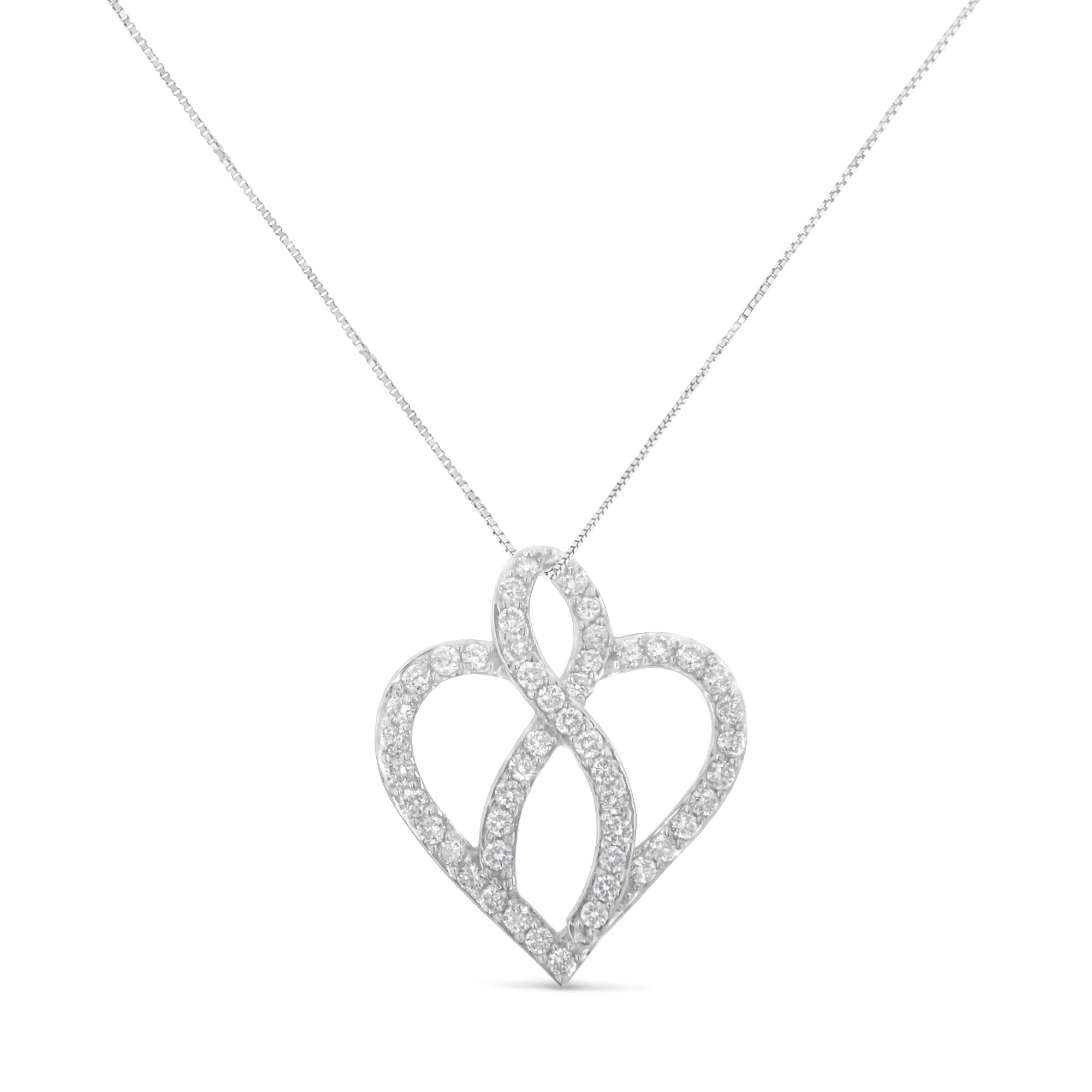 This lovely 14k white gold heart pendant necklace features 1 carat of beautiful, natural diamonds. The heart is intersected with a ribbon at its center, and both motifs are embellished with round-cut diamonds in an elegant prong setting. This pendant hangs from a box chain and will add the perfect amount of sparkle to your everyday wear.