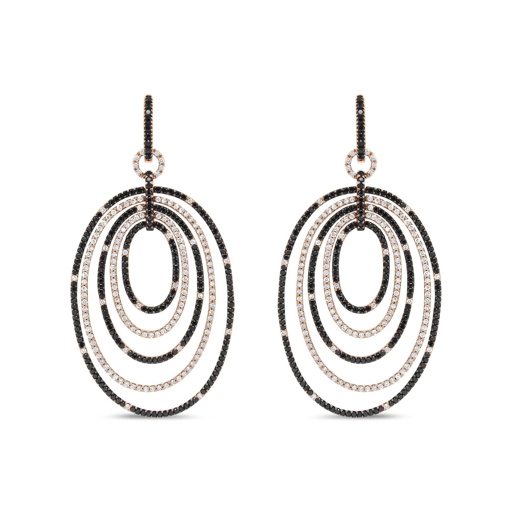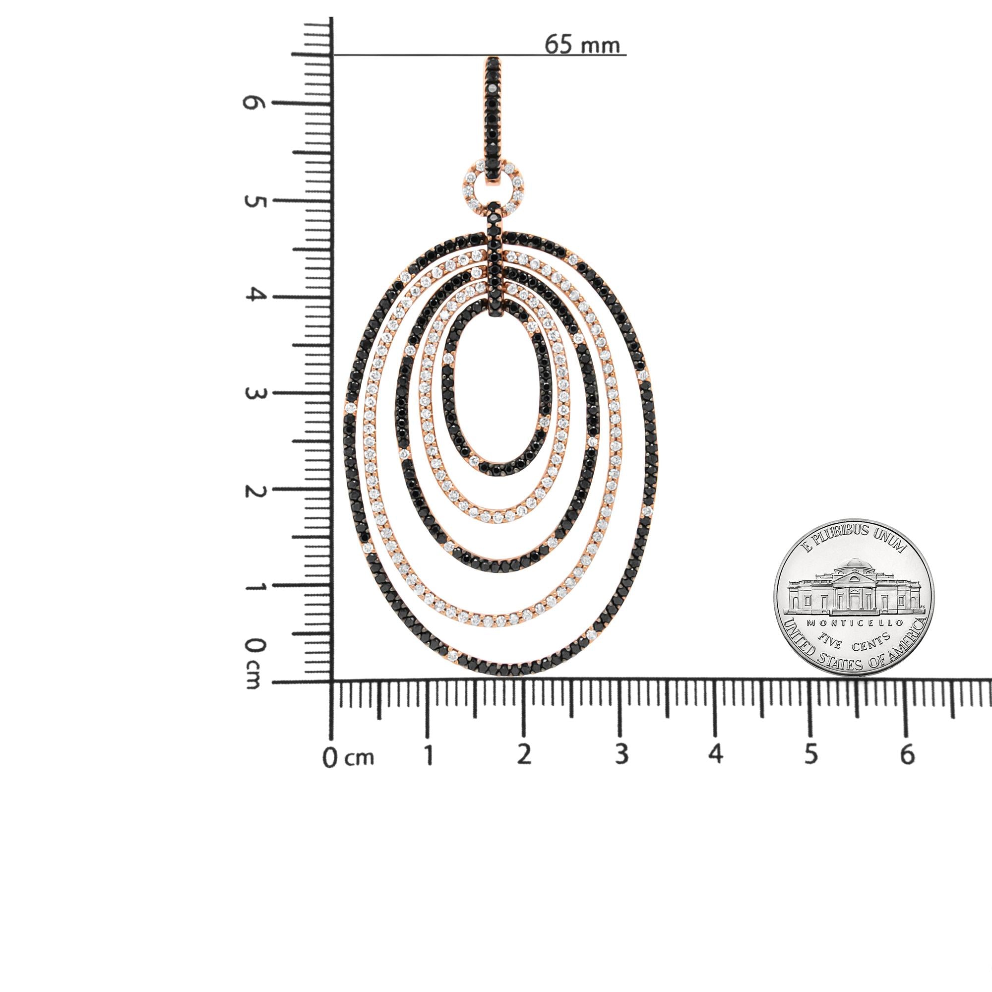 The fearless and bold design of these 18k rose gold earrings make it the eye-catcher it is. Heightened with the allure of 710 round, prong-set diamonds, this pair is nothing short of dazzling! A total of 5 hoops in graduated sizes features an alternating pattern of black and white diamonds, with one color dominating over the other in turn. Diamonds encrust the bail and upper dangle for endless glitter, with a total 5.00 cttw and an approximate Black and F-G Color, and VS1-VS2 Clarity. Latch findings keep these pierced earrings secure on the ear for all-day wear.
