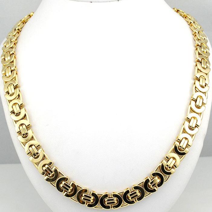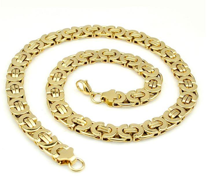 Solid Stainless Steel 9mm Flat Byzentine Chain in 24 inch length with matching 8.5" bracelet with lobster lock in 14K Yellow Gold plating by Bling Master available at low wholesale hip hop jewelry price, manufactured in our China factory.