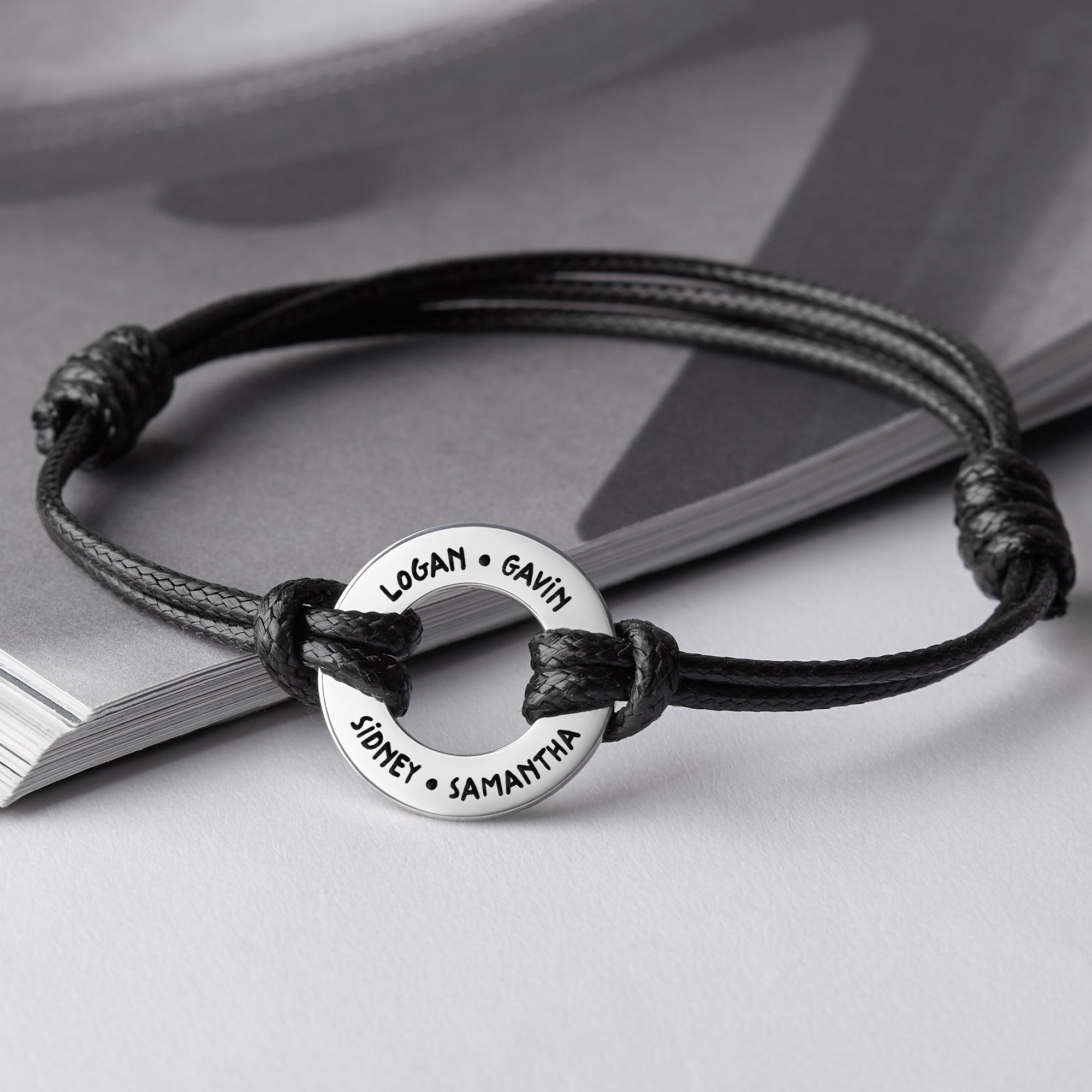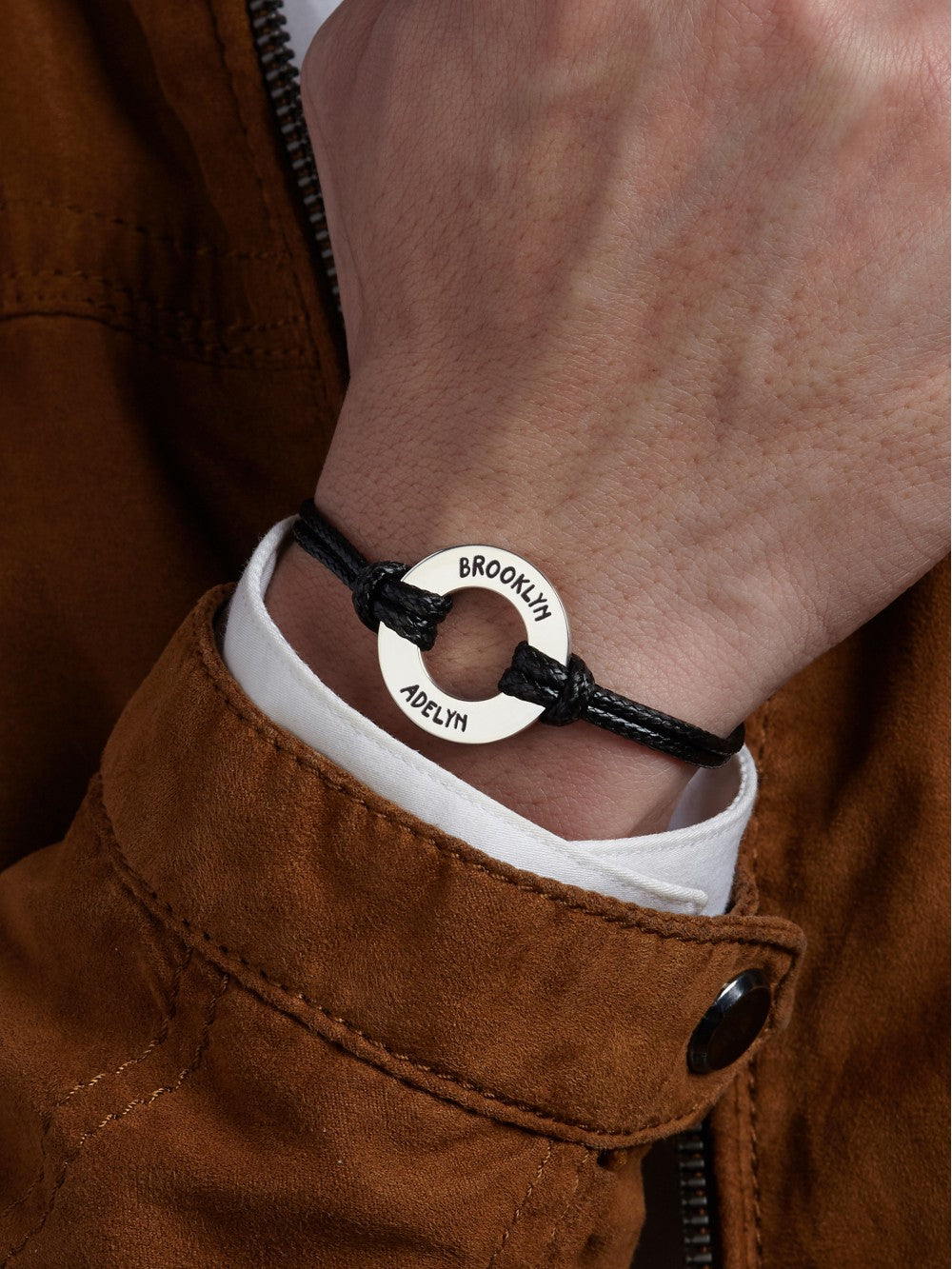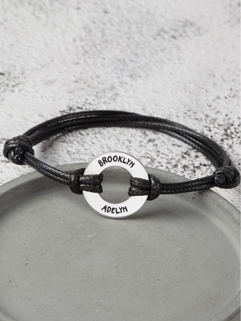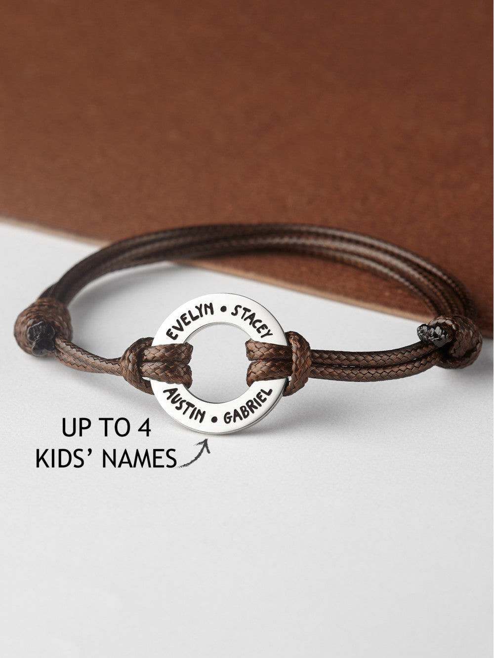 This coated leather cord bracelet is engraved with kids' names. It can be also personalized on the backside with a short phrase. Available in sterling silver with 18K gold plate options, this is the perfect gift for Dad on Father's day or a special day.