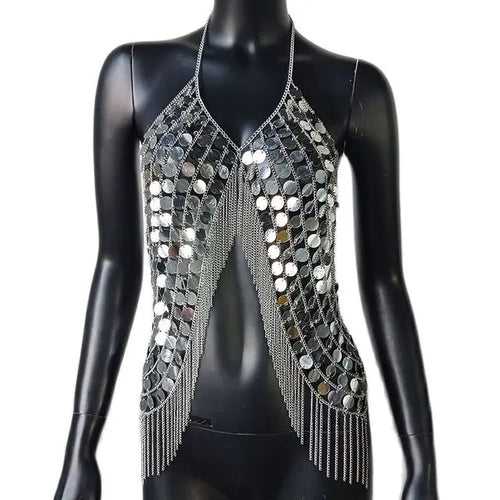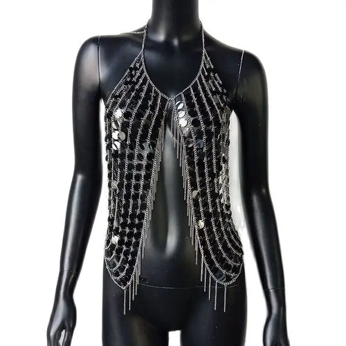Festival Bling Plastic Sequined Crop Tops Women 2023 Sexy Metal Chain Tassel Nightclub Dance Wear Party Burning Outfits Tank Top
