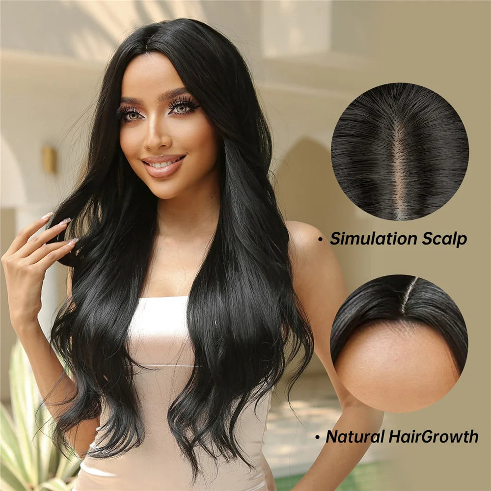 Black Long Wavy Synthetic Wigs Middle Part Natural Wave Wig Heat Resistant Cosplay Party Daily Hair Wig for Women and Girls