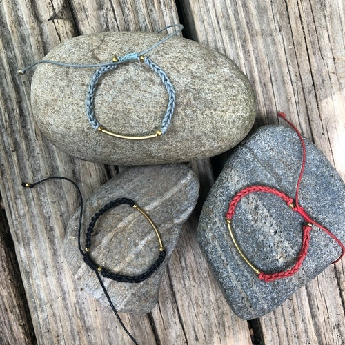 This minimal but sleek bracelet is perfect for layering with your other favorite wristwear. Cotton thread is woven together and adorned with an edgy bar to complete this perfect staple piece.