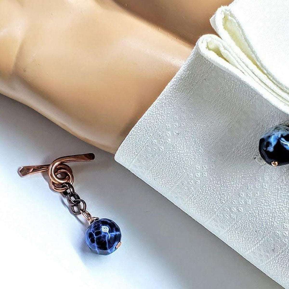 Help raise awareness to prevent Child Abuse with these handcrafted unique copper chain cufflinks which feature each beautiful black blue crackle agate beads of 10mm. When I was designing these I was thinking that the blue and black agate beads symbolizing very well the child and what abuse does to a child, It takes over their life, just like the black in the agate seems to take over the stone beads. The shiny rose gold colored hammered copper loop toggle gives these handmade chain cufflinks a touch of elegance.