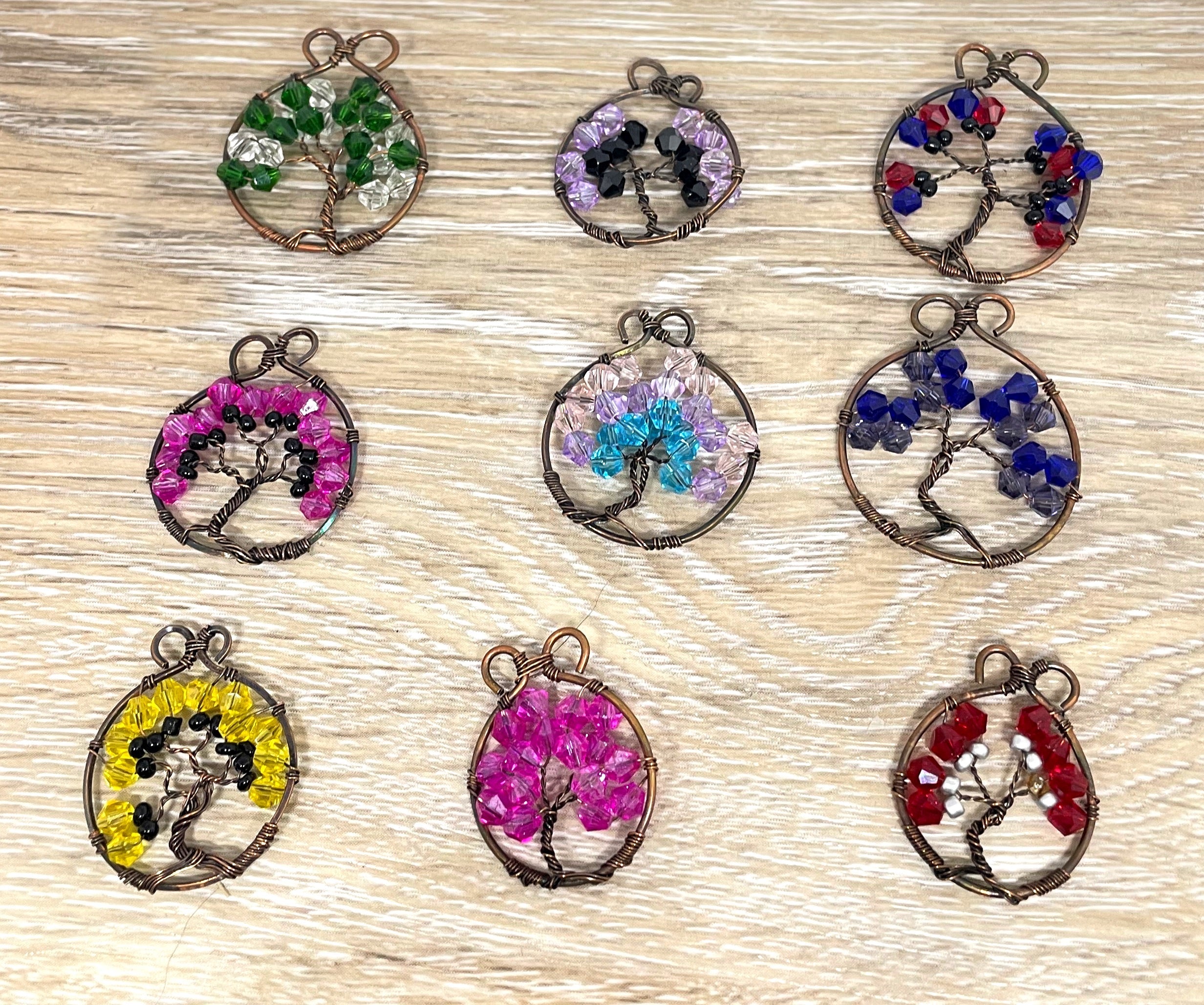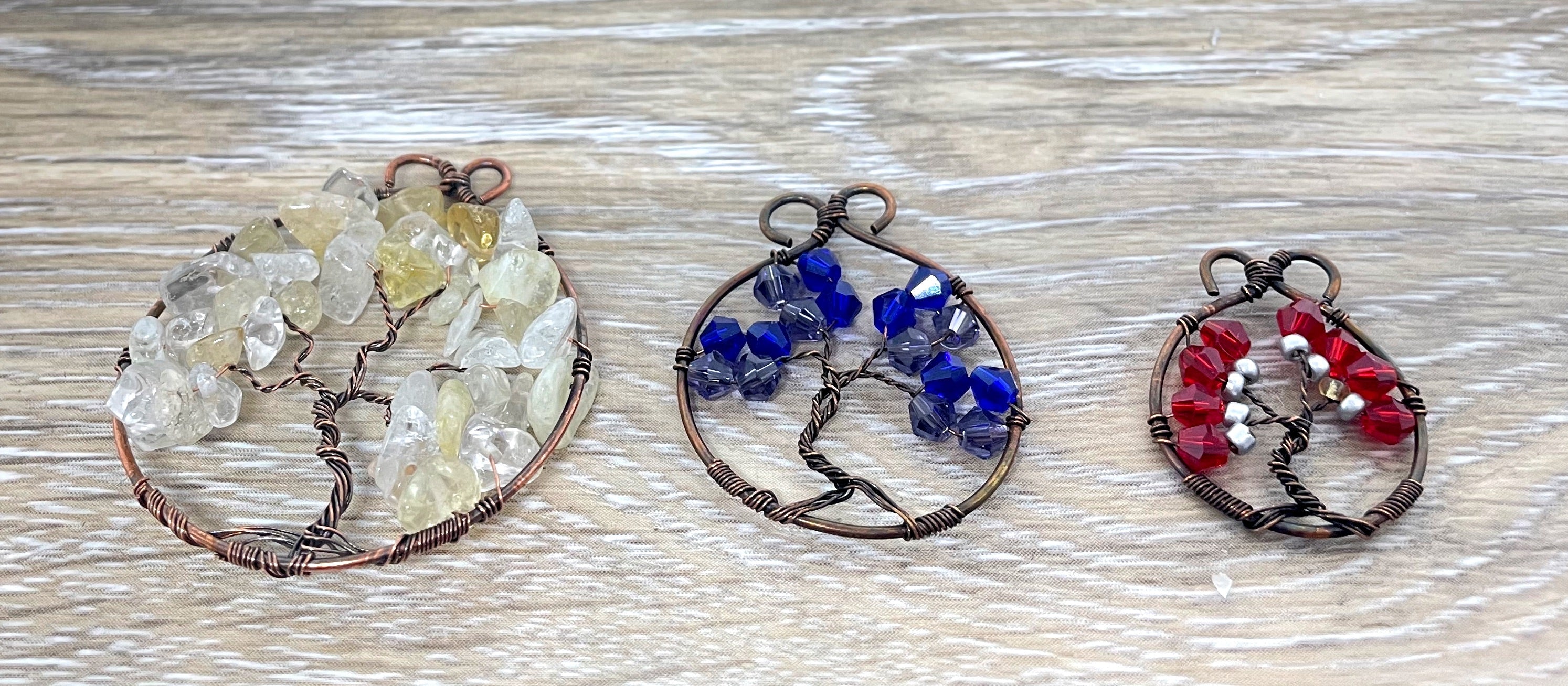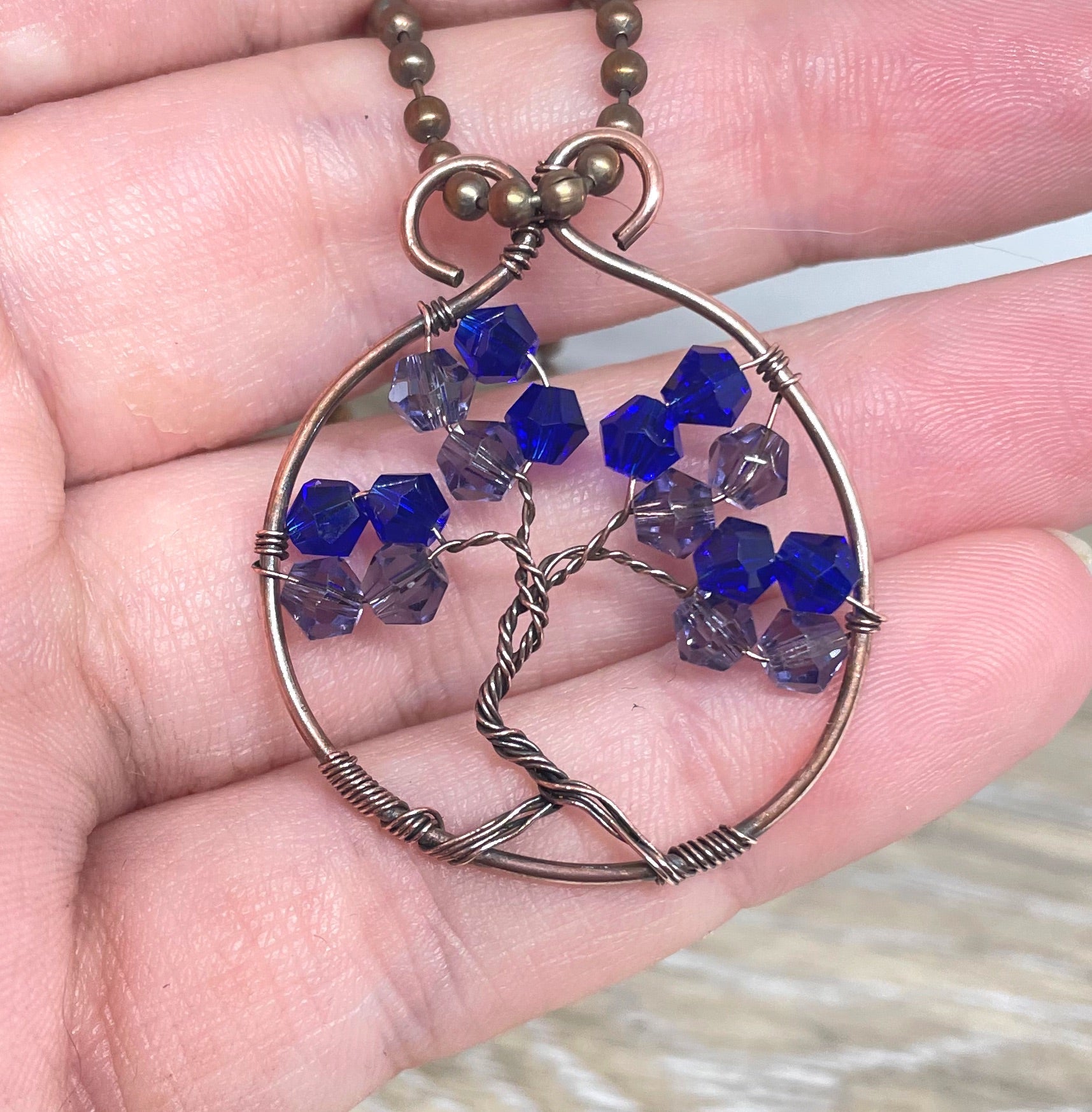This piece features a tree of life with gemstone chips wrapped in oxidized copper wire, and rests on a 18” ball chain.