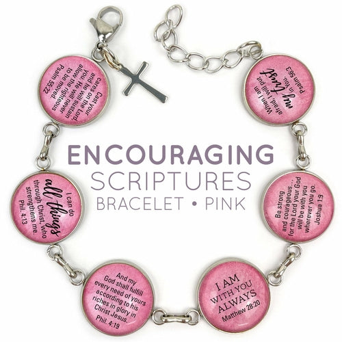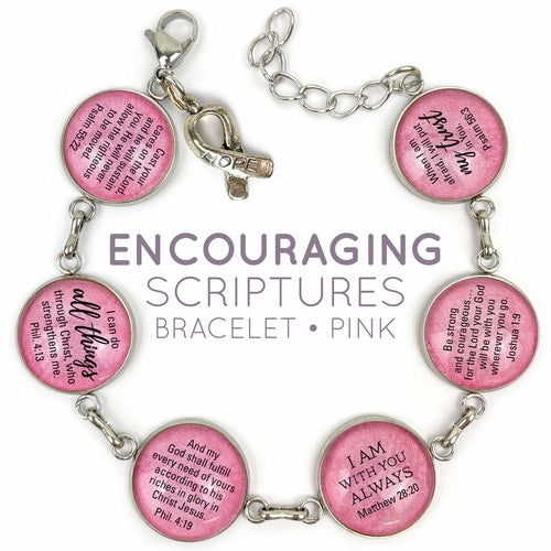 This beautiful charm bracelet features six encouraging Bible verses magnified under glass on your choice of a pink or a neutral-colored background, and a dangling "Hope" ribbon charm, a cross charm, or a heart charm.