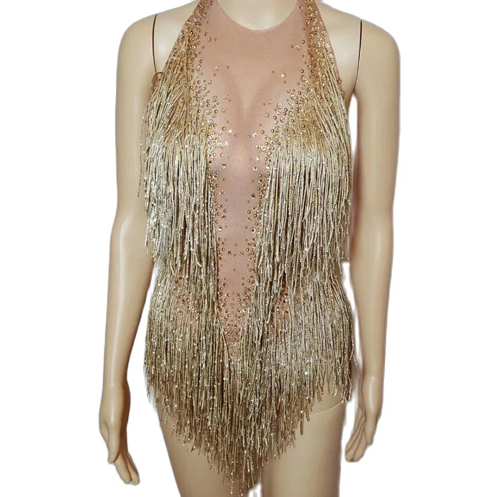 Gold Rhinestones Bodysuit Women Fringes Backless Latin Sexy Stage