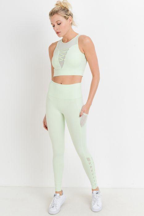 This pair of mesh leggings combines strap accent with mesh panels, resulting in a combo that looks edgy and sleek. The highwaist offers abs support whilst the mesh pockets on each side provide hands-free workout experience.