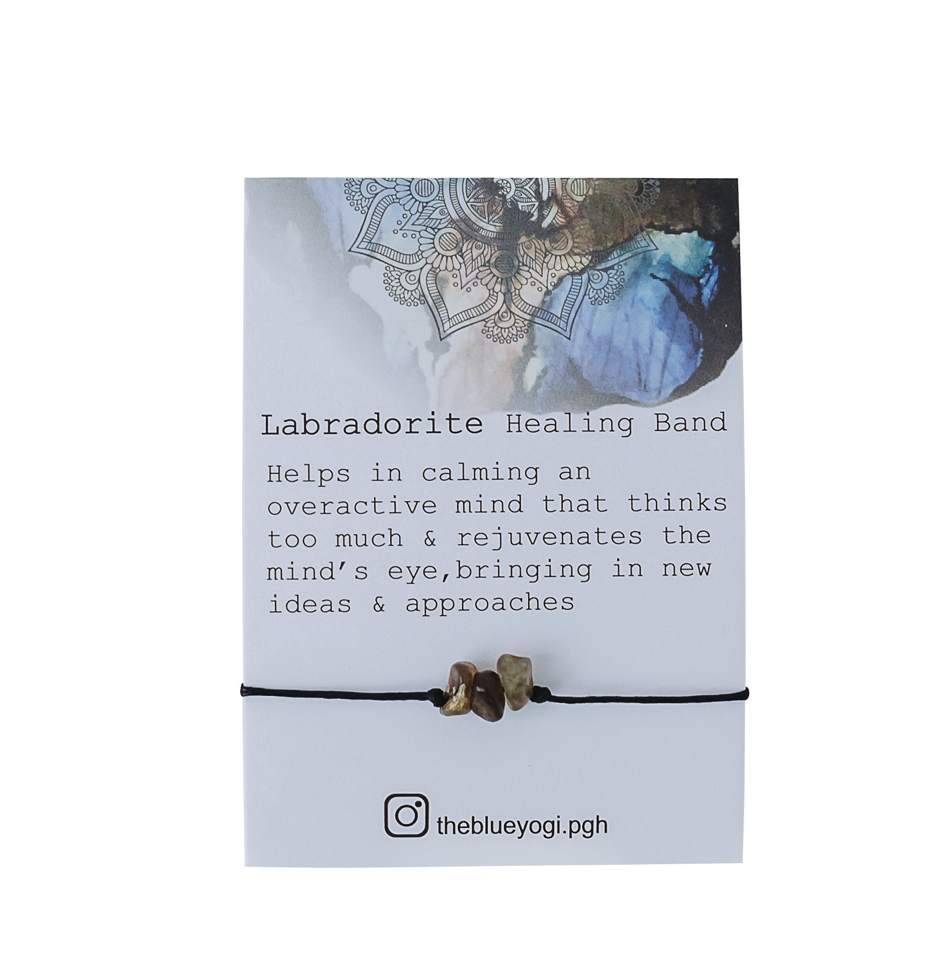 Casual, Boho, everyday gemstone Healing band. Each Bracelet is 10” long and has tie closure. Can be used as an anklet or bracelet. Made of Natural Gemstones . The bands are simple, light weight and with tie closure. The bracelet is meant to be worn at all times till it gets loose or worn out MAKE A WISH Close your eyes & make a wish, then tie this bracelet on your wrist, when the bracelet breaks in two, the wish you made might just come true. Each Bracelet comes with a card with a watercolor Mandala art and healing properties of the crystal (as shown in photo) Healing with Labradorite A stone of transformation, Labradorite is a useful companion through change, imparting strength and perseverance. It balances and protects the aura, raises consciousness and grounds spiritual energies. Excellent for strengthening intuition - promoting psychic abilities. Each Bracelet is handcrafted and the gemstones are natural & unique so the order, size & shape of the gemstones will differ. ***Disclaimer Healing’ is a general non-medical term used throughout this shop to describe one of the beneficial and energetic properties of natural gemstones. All properties attributed to the gemstones sold on this website are based on ancient folklore and traditional uses. All ‘healing’ or ‘energy’ jewellery sold on this shop is created with the intent to assist with the increase or balancing of subtle energy vibrations within the body. The products and information found here are NOT intended to diagnose, treat or prevent any disease, nor replace professional medical advice.