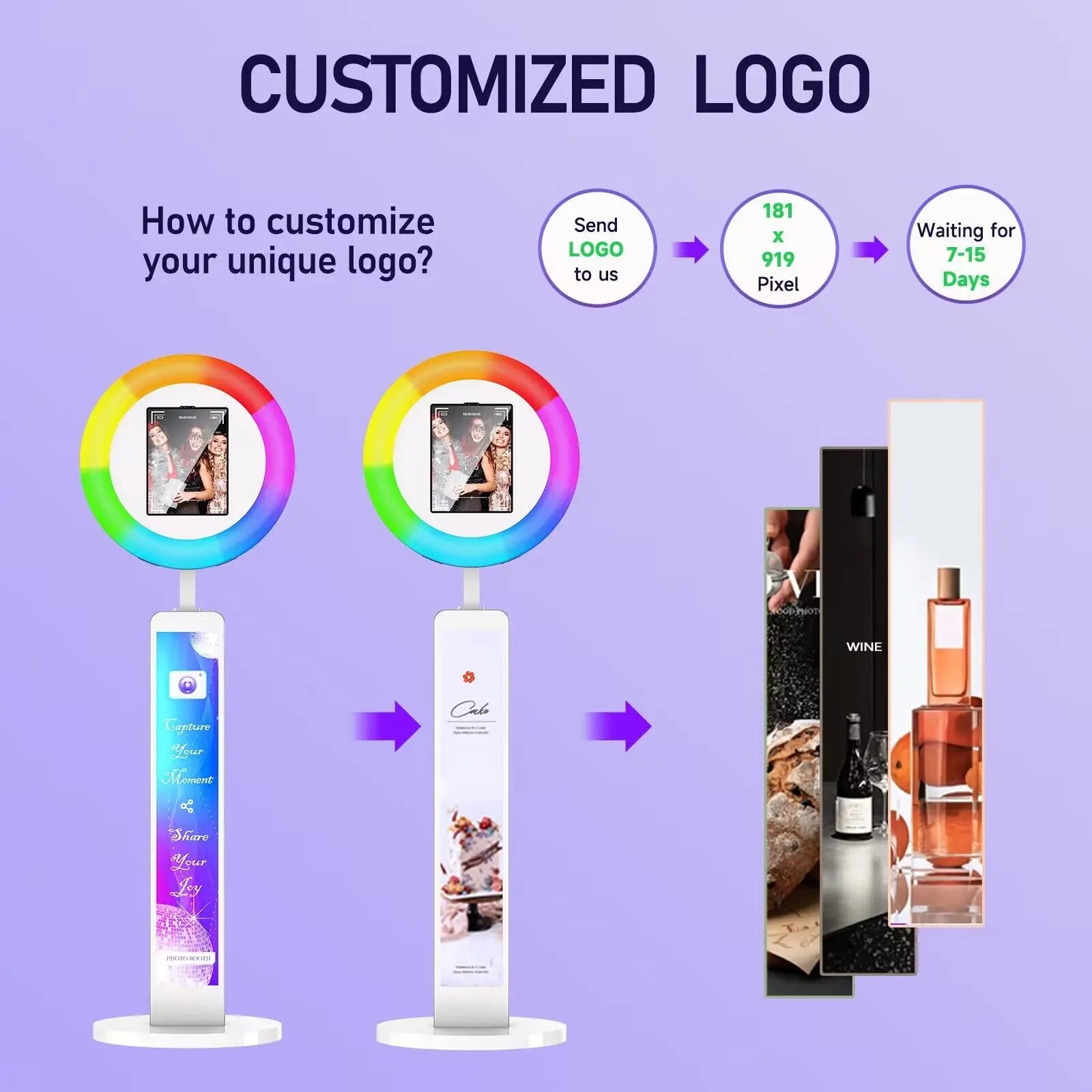 【CUTOMIZE LOGO FOR FREE】The Ring Light Stand is a light box made of metal with a transparent acrylic plate with slots on the front. We provide FREE LOGO, advertising poster customization services.YOUR FIRST CUSTOMIZED LOGO is FREE to every photo booth order after payment from our store, please contact us WhatApp:+8615018814309 and provid the clear logo , advertising posters, etc. into the slot to promote the brand and show personality.