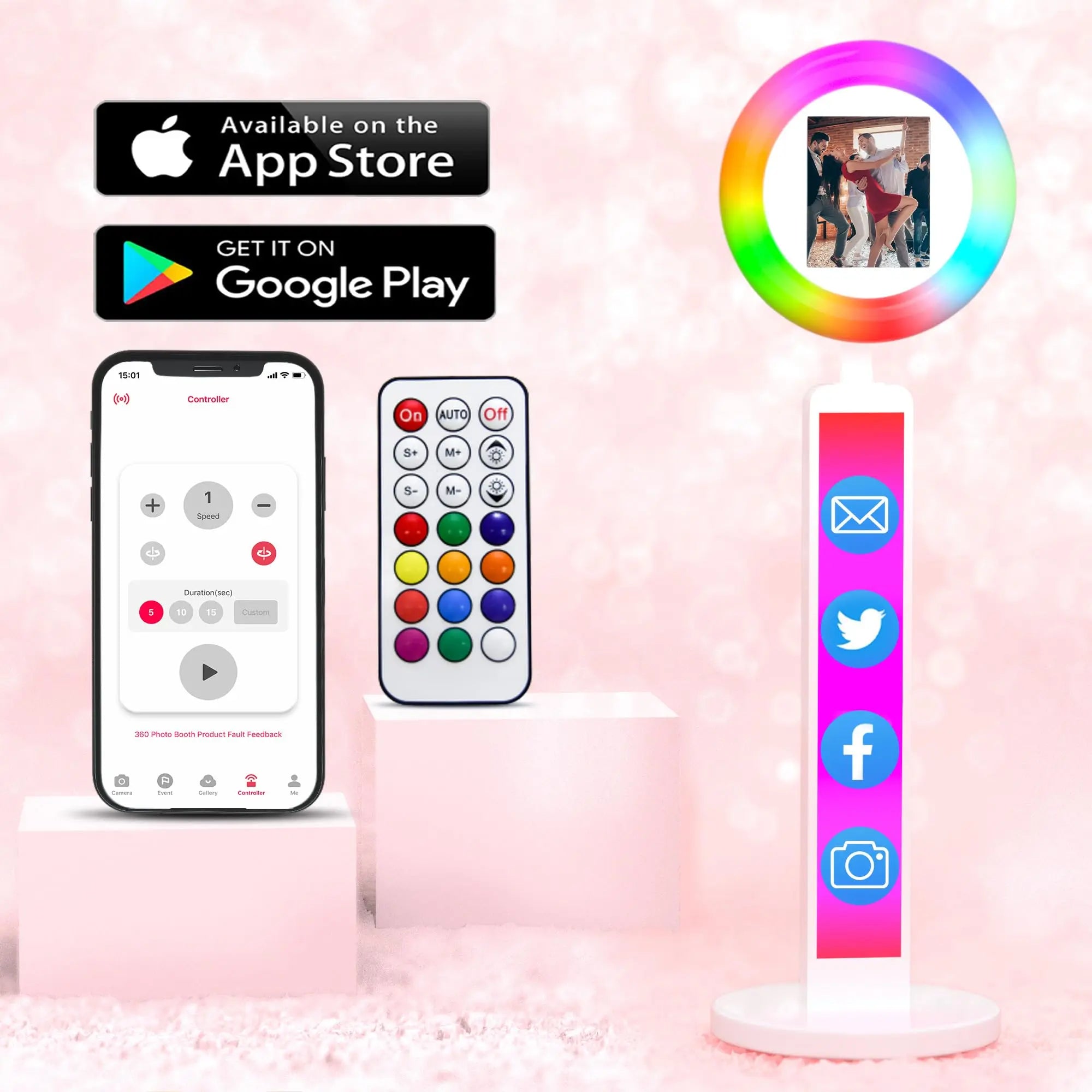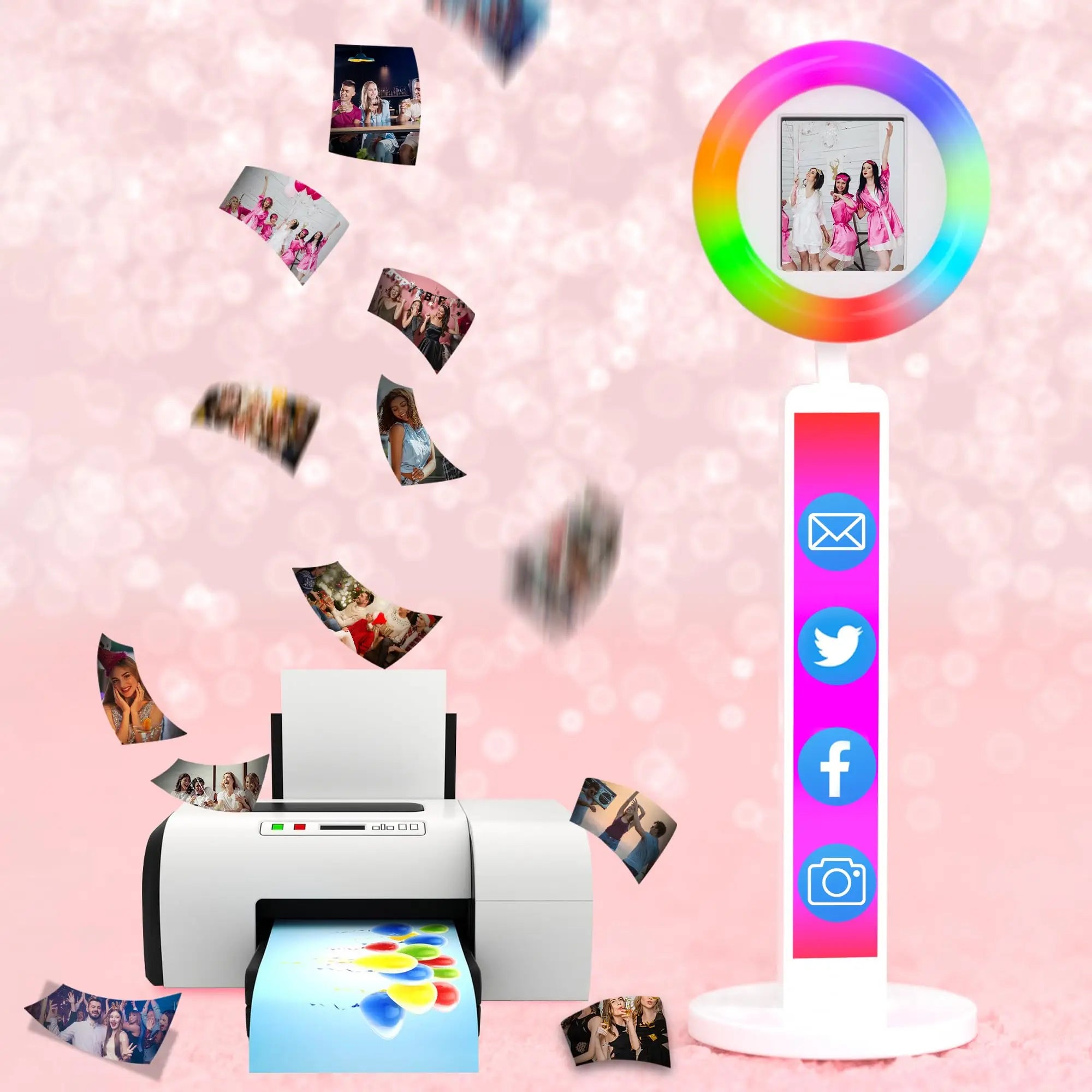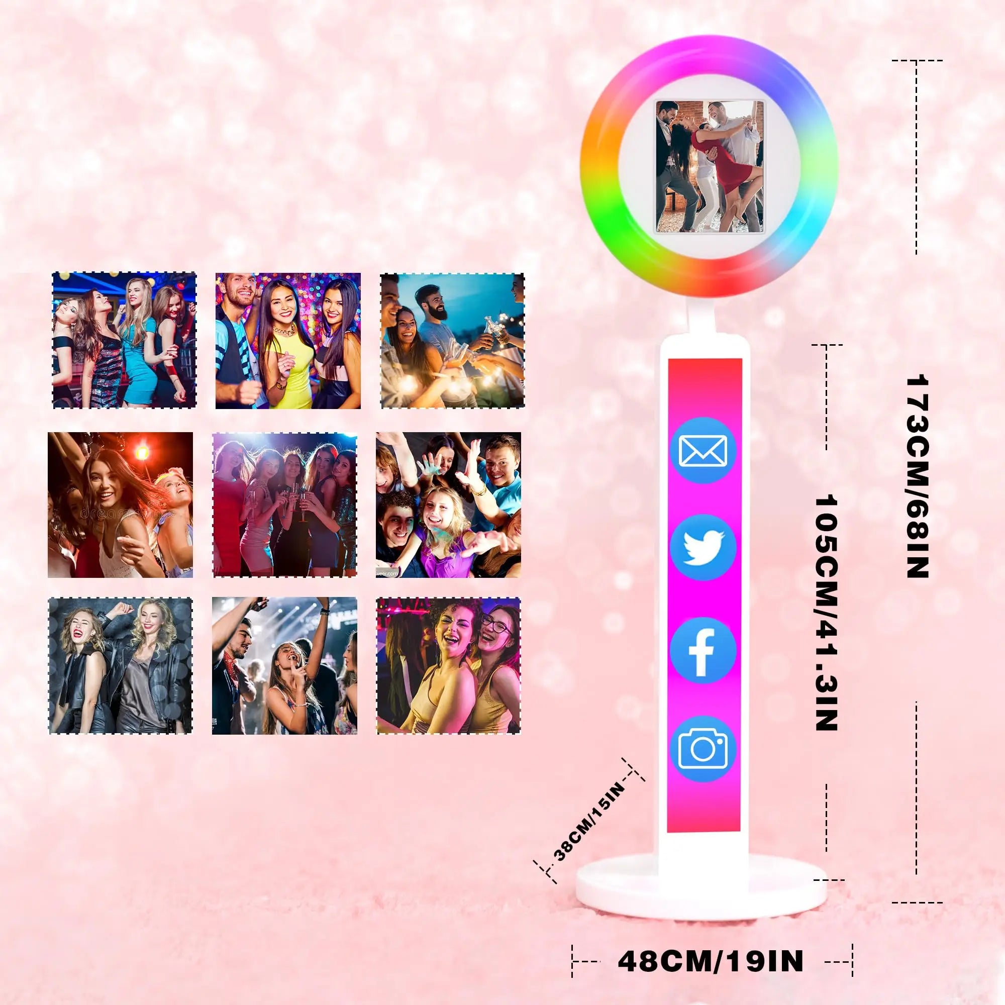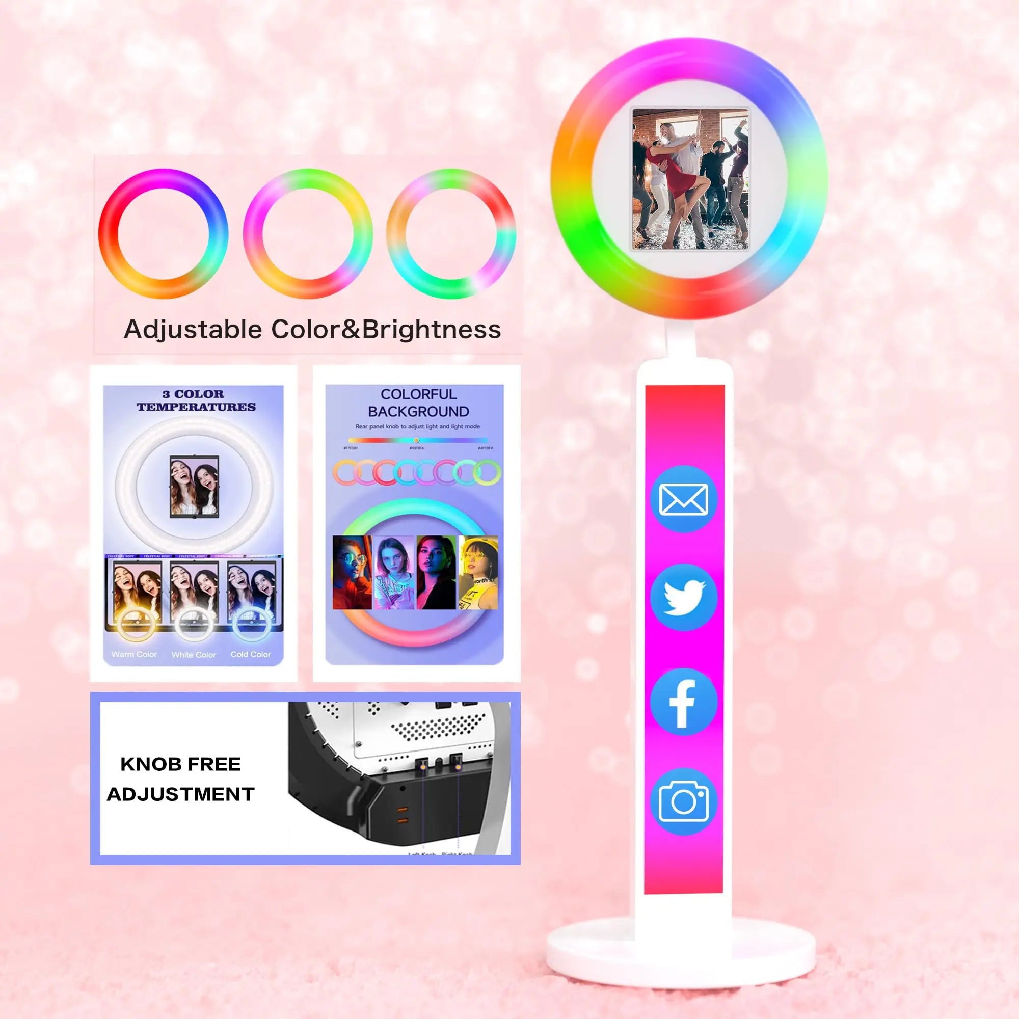 【Photo Booth RGB with Ring Light】This Portable Photo Booth is equipped with RGB ring light, 20+ color lighting modes, each lighting mode can choose 1%-100% brightness. you can adjust the color temperature (2700K-6500K) and brightness (0%-100%) by the remote control. And the angle of the ring light is flexible and adjustable.