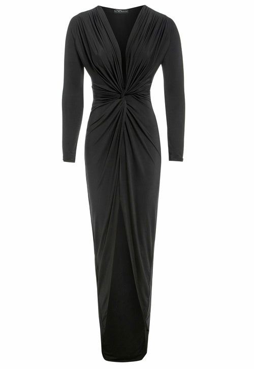 This slick long, sleeve midi dress is cinched in at the waistline with a sophisticated front knot design. Bianca's deep plunge v-neck and tantalizing thigh slit will be the statement piece all year round.