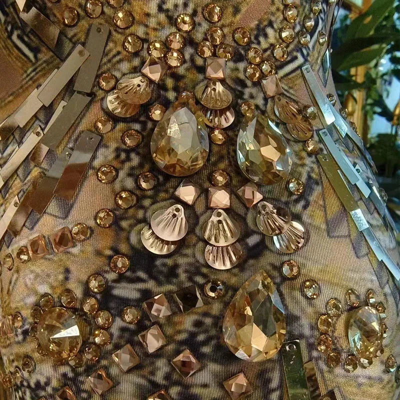 Luxury sequin print Fringes crystal rhinestones gold jumpsuit women