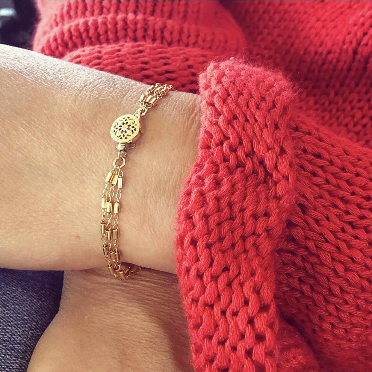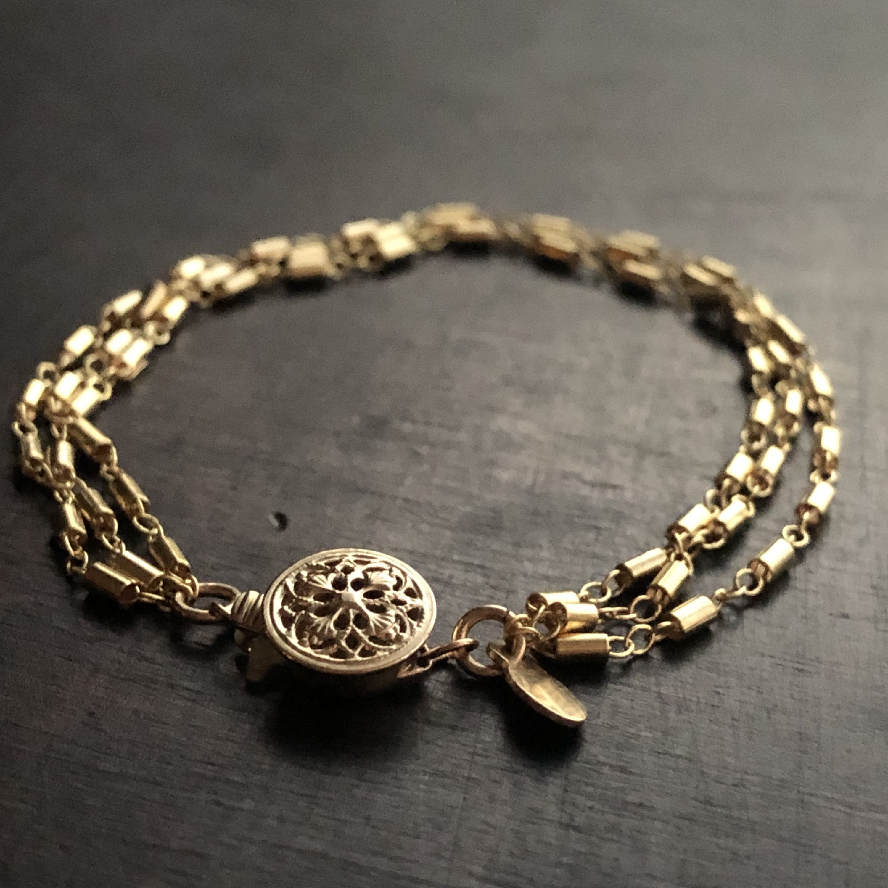 This radiant bracelet is lovely worn alone as it's already stacked with 3 layers of beautiful, shiny gold fill bar & link chain accented by a filigree clasp.