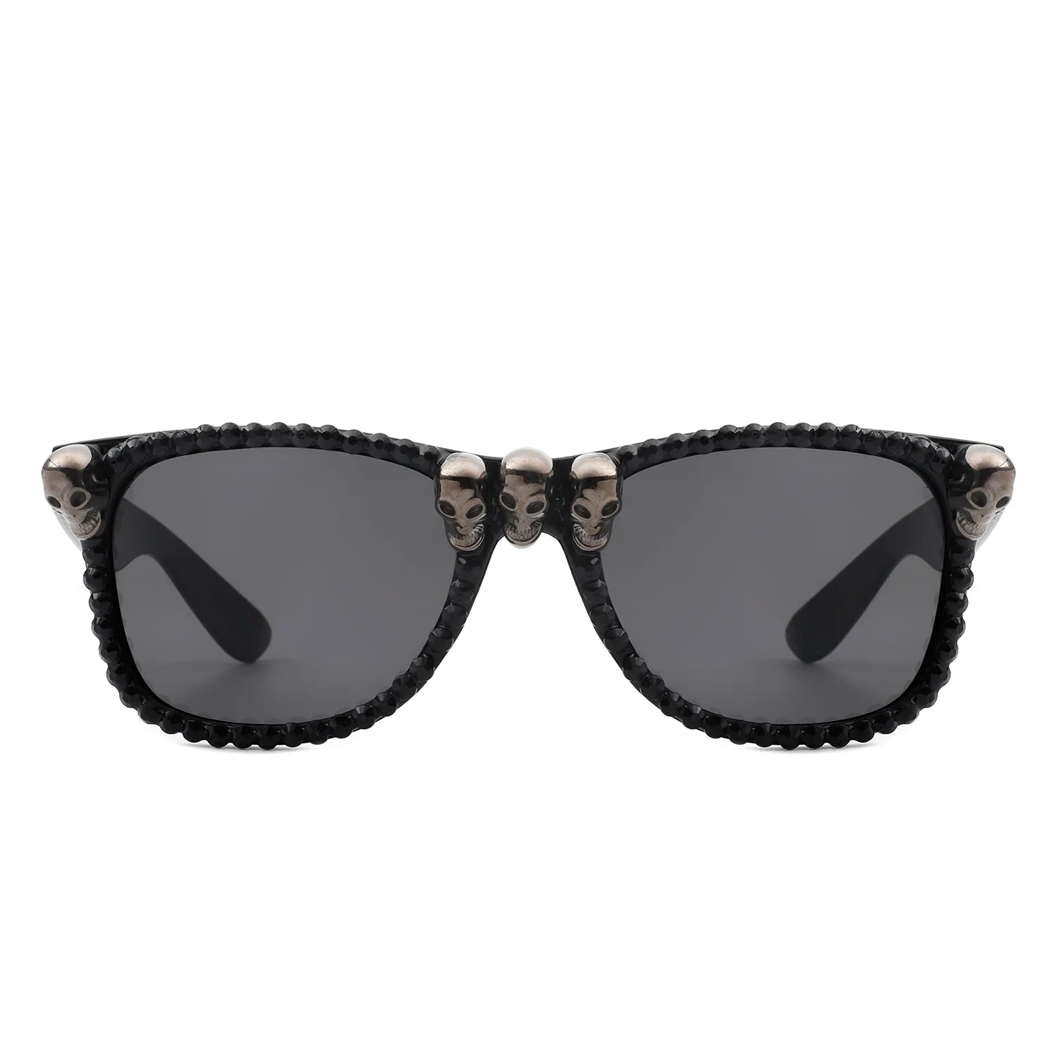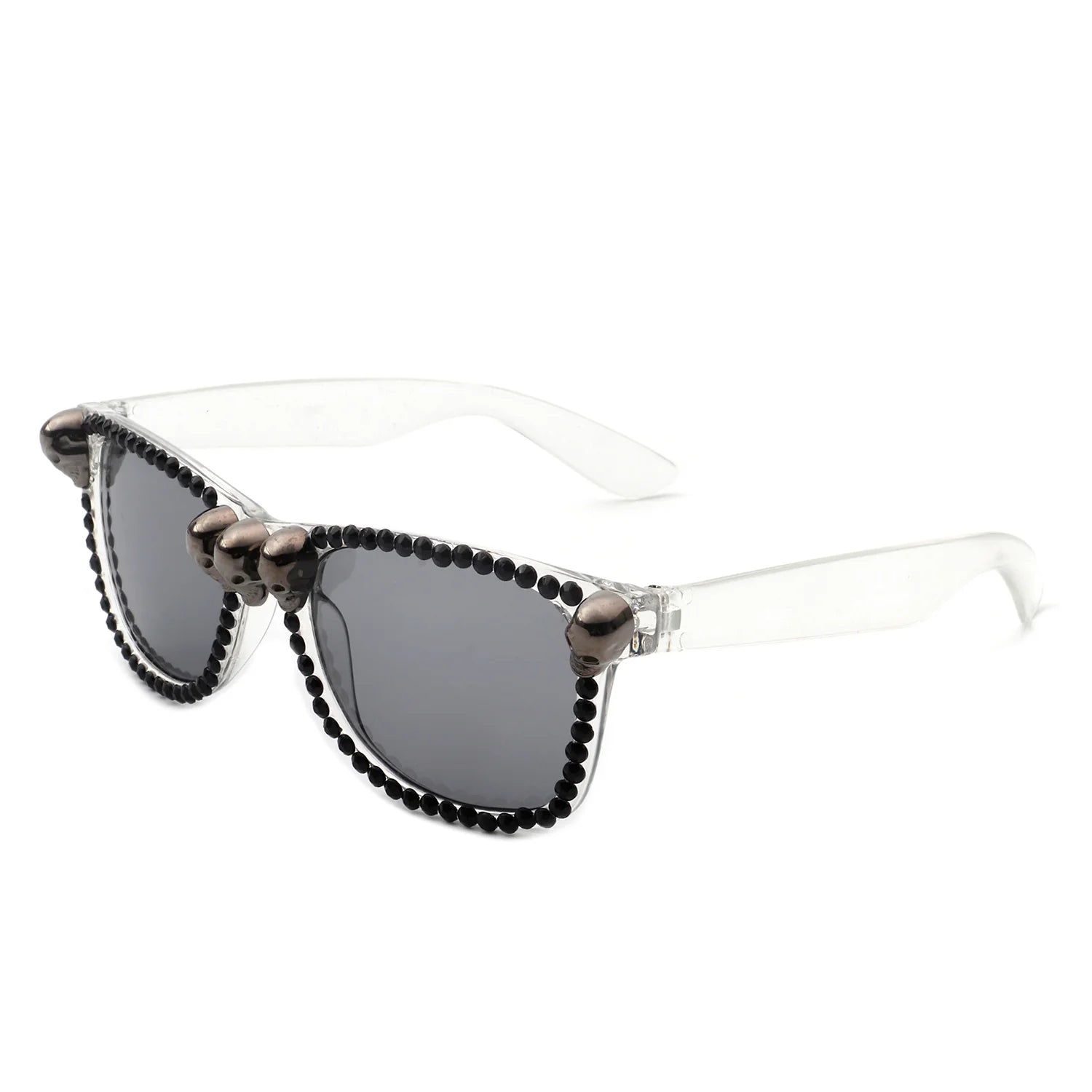 The Classic horn rim rhinestone gothic skull square sunglasses are a versatile accessory that combines style, comfort, and protection. The lenses are made from polycarbonate (PC), known for their impact-resistant qualities, which means they can withstand the rigors of daily life without easily scratching or breaking. 100% UVA & UVB protection is important for safeguarding your eyes from the harmful effects of the sun's rays. The sunglasses come in a complete stylish packaging box, with a microfiber cleaning cloth and pouch. Whether you're out for a drive, enjoying a day at the beach, or just walking around town, you can feel confident that your eyes are well-protected.
