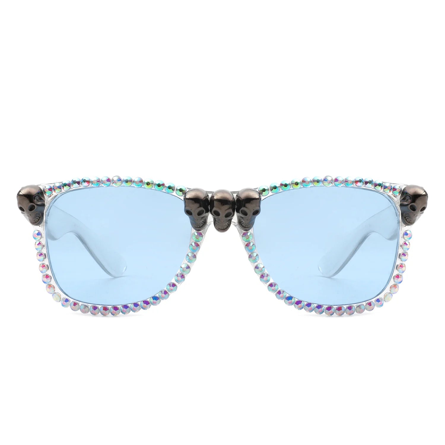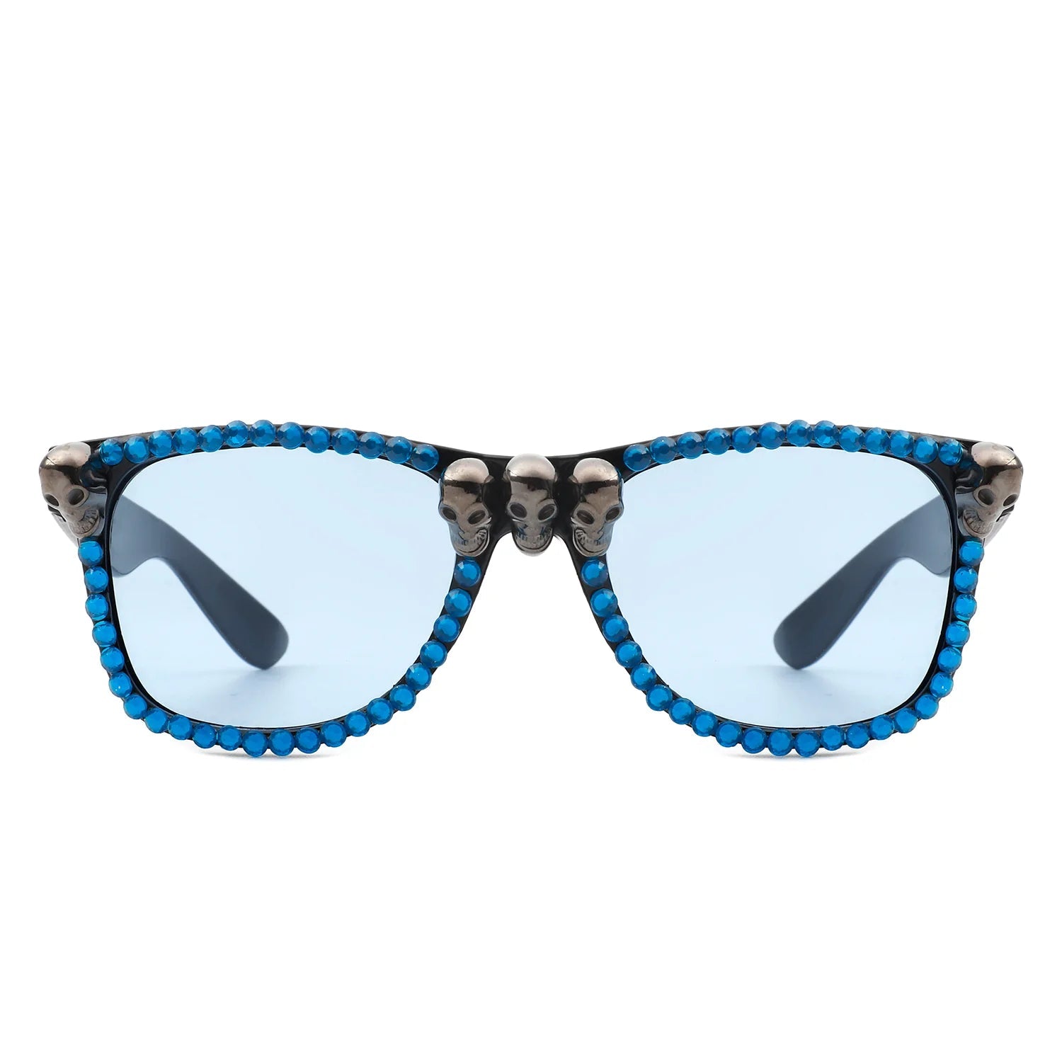 𝐑𝐇𝐈𝐍𝐄𝐒𝐓𝐎𝐍𝐄 𝐆𝐎𝐓𝐇𝐈𝐂 𝐒𝐊𝐔𝐋𝐋 𝐃𝐄𝐒𝐈𝐆𝐍: The design of these sunglasses is truly unique, with rhinestone embellishments that add a touch of glamour and a gothic skull detail that provides an edgy contrast. The sunglasses are not just protective eyewear but also a fashion accessory that can complement a variety of outfits and styles.