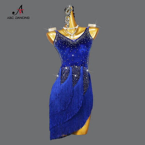 New Blue Velvet Latin Dance Dress Competition Costume Sexy Fringed