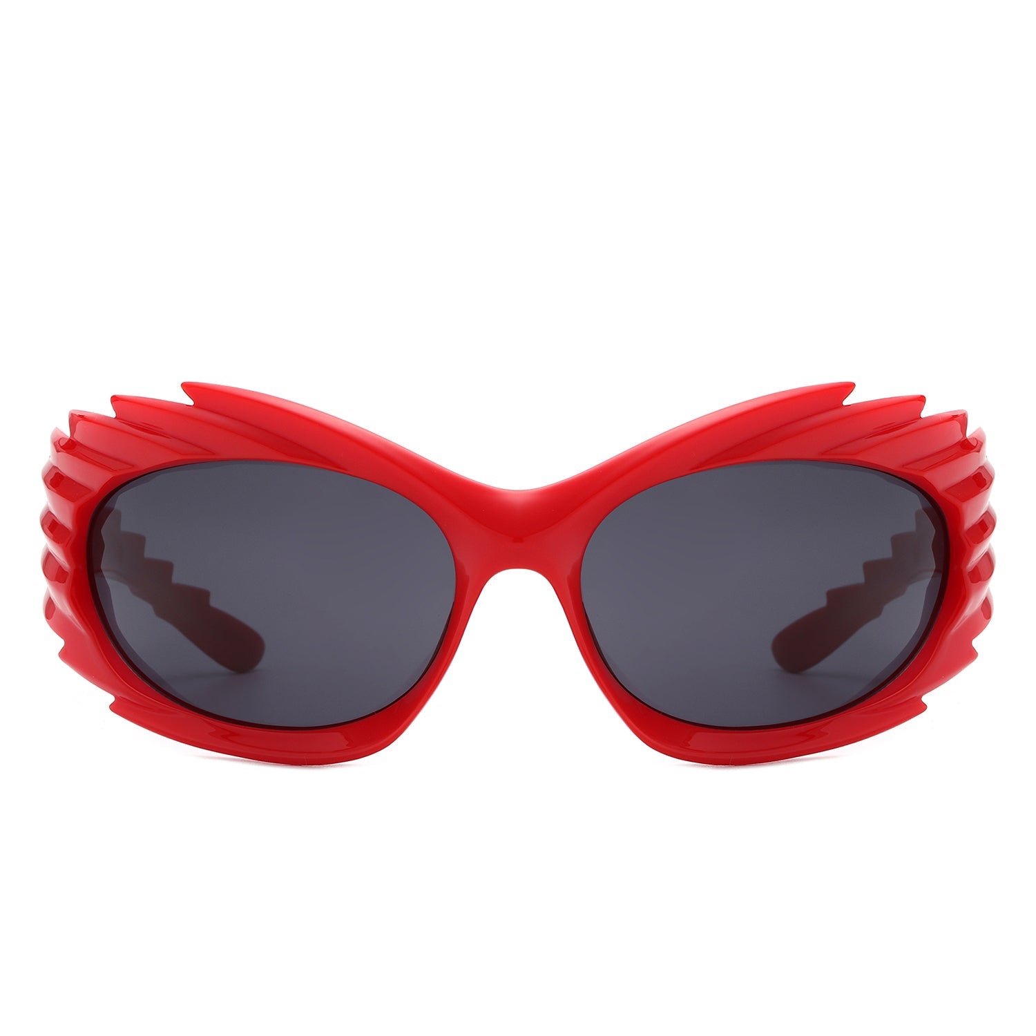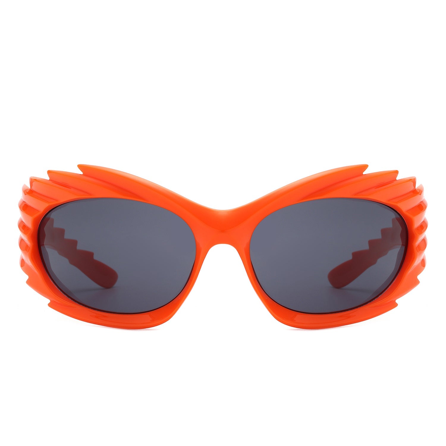 These wrap-around oval spike sports sunglasses are the perfect combination of style and function, with a unique and trendy look. The wrap-around design provides superior coverage and protection while the lightweight and comfortable fit makes these sunglasses perfect for any activity. The sunglasses come in a complete stylish packaging box, with a microfiber cleaning cloth and pouch. These sunglasses are suitable for daily travel, selfies, driving, partying, and shopping.
