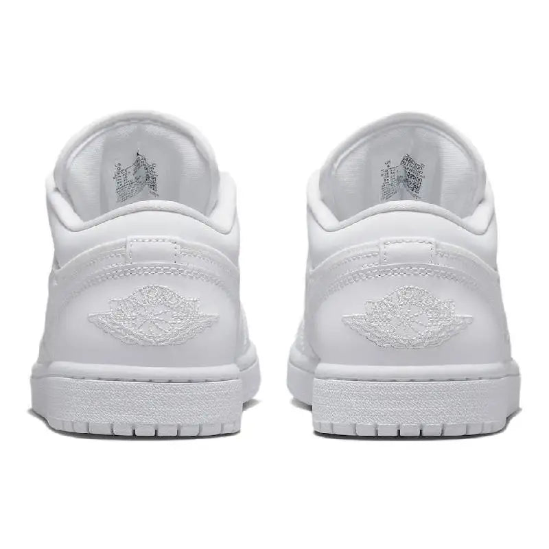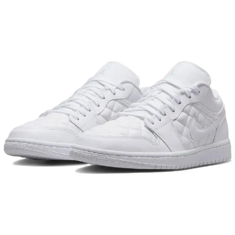 The Air Jordan 1 Low Quilted White (Women's) is a pristine monochromatic sneaker specifically sized for women. This classic silhouette is given a bit of a twist in this functional and stylish low-top sneaker. The Quilted White Air Jordan 1 Low-Top for Women sports an upper that features a unique base of white quilted leather. Smooth white leather overlays accent the toe, vamp, eye stays, collar, and heel. The side-panel Nike swoosh is also smooth white leather. The laces, tongue, sock liner, and insole are also a sleek, crisp white. The white foam midsole with tonal stitching sits atop a white rubber outsole patterned to provide traction. What our shoe experts enjoy most about this sneaker are the hits of tonal branding, specifically the Wings logo embroidered on the heel and the Jumpman embroidered on the tongue tag. The Air Jordan 1 Low Quilted White (Women's) was released on October 1, 2020, for a retail price of $90.