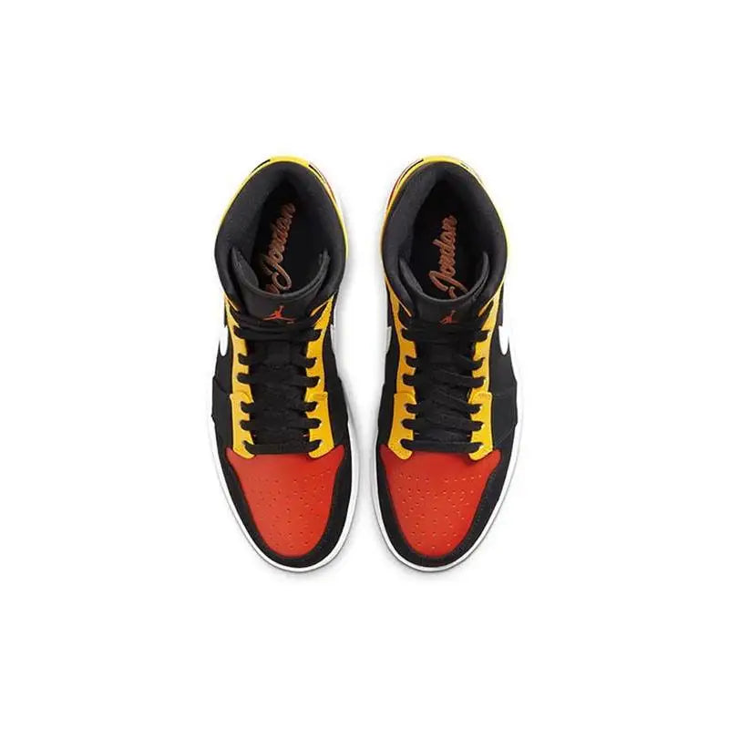 The Jordan 1 Mid Black Amarillo Orange features a black, orange, and yellow nubuck and leather upper, with the nubuck base. From there, a white Nike "Swoosh" and "Jumpman" and "Air Jordan" accents complete the design. The Jordan 1 Mid Black Amarillo Orange released in January of 2020 and retailed for $125.