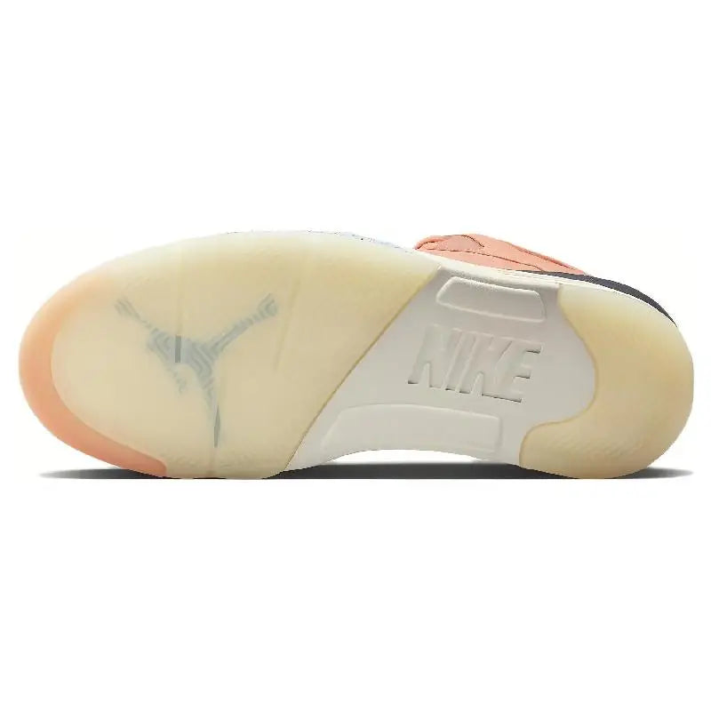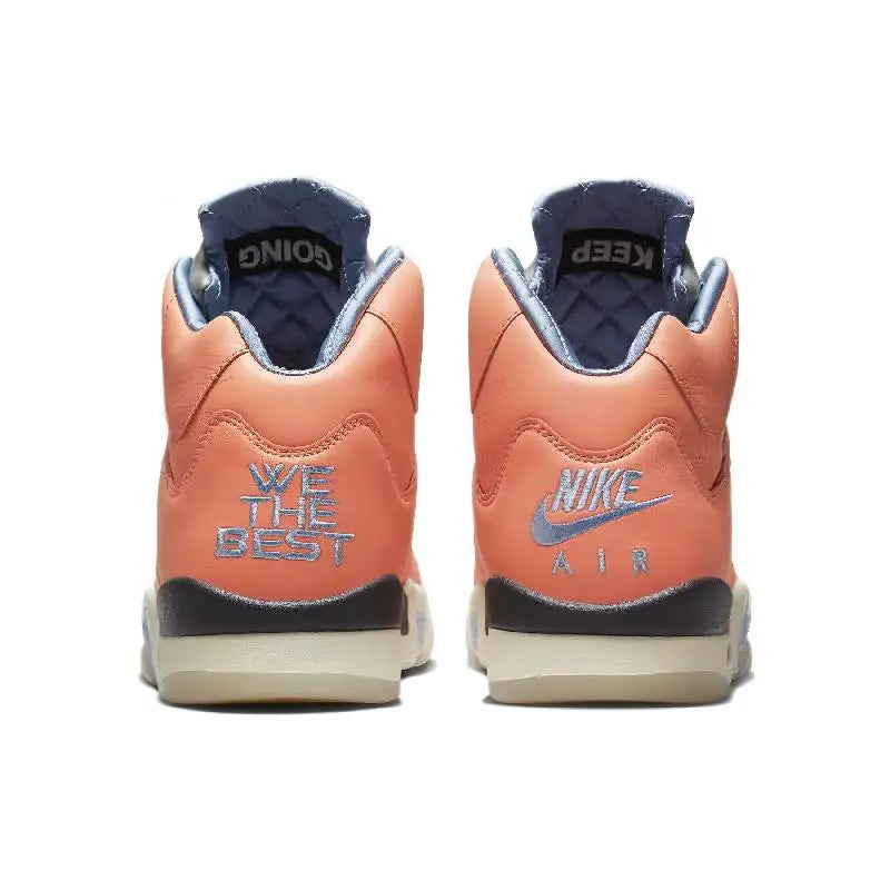 The Air Jordan 5 Retro DJ Khaled We The Best Crimson Bliss is a collaboration between footwear brand and the American musician. This Retro Air Jordan 5 comes in crimson bliss , leche blue-sail colorway. The upper is coral leather with a Leche Blue quilted lining. Each heel overlay has the Nike Air logo on the right and 'We the Best' on the left. Reflective silver tongues feature Jumpman branding. Off-white polyurethane midsole with blue shark-tooth detailing and Air-sole unit in heel. Mismatched Jumpman and 'We the Best' branding appear on the outsoles. The Air Jordan 5 Retro DJ Khaled We The Best Crimson Bliss was released on the 28th of November 2022, retailing for $225.