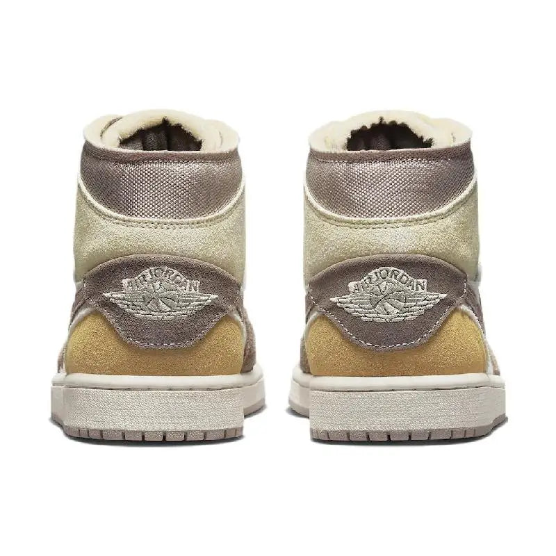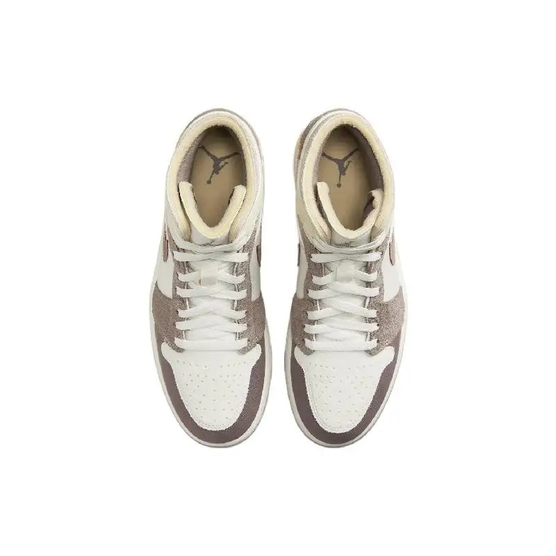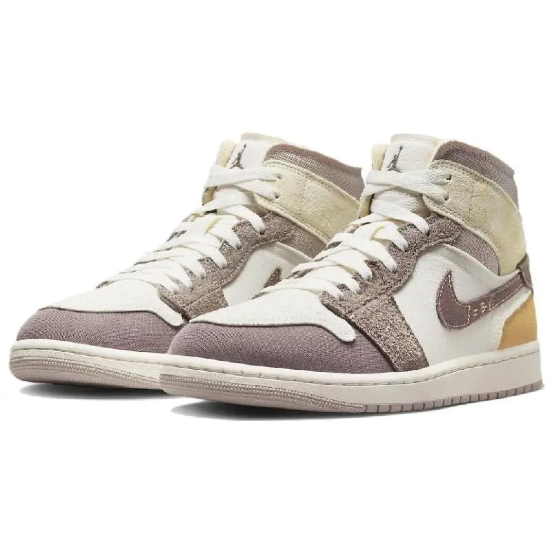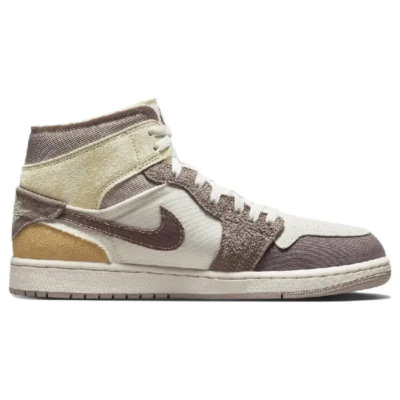 The Air Jordan 1 Mid SE Craft Taupe Haze comes in a Sail, Taupe Haze, Fossil Stone, Celestial Gold, and Muslin color palette. The Taupe Haze Air Jordan 1 Mid SE Craft features an upper made from a mixture of leather and suede. The shoe has a cushioned midsole, featuring Nike Air technology for responsive cushioning and impact absorption. The sneaker's outsole features a durable rubber material, providing sturdiness and traction. The shoe also features additional details, including a perforated toe box for breathability and a padded collar and tongue for comfort. The shoe's design is completed with branding details, including the Nike Swoosh on the sides, the Jumpman logo on the tongue, and the Air Jordan Wings symbol on the heel. The Air Jordan 1 Mid SE Craft Taupe Haze boasts a standout feature with its unique and eye-catching colorway. The combination of earthy taupe hues with vibrant accents creates a distinct and stylish look. This sneaker's design pays homage to the iconic Air Jordan 1 silhouette, while adding a contemporary twist. The sneaker was released on January 24, 2023, and sold for a listing price of $135.