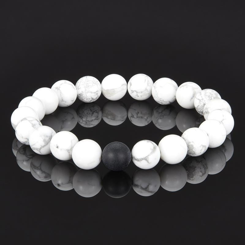 Wear this sharp and stylish Howlite beaded bracelet to pair with your watch or layer 2 or 3 colors together to reflect your unique style. The stylish stretch bracelet features 20 natural stone beads contrasting a single matte black onyx bead. The stretch cord makes it easy to wear and remove the bracelet and fit your wrist comfortably. The beaded bracelet has a total of 21 natural stone beads measuring 10mm wide.