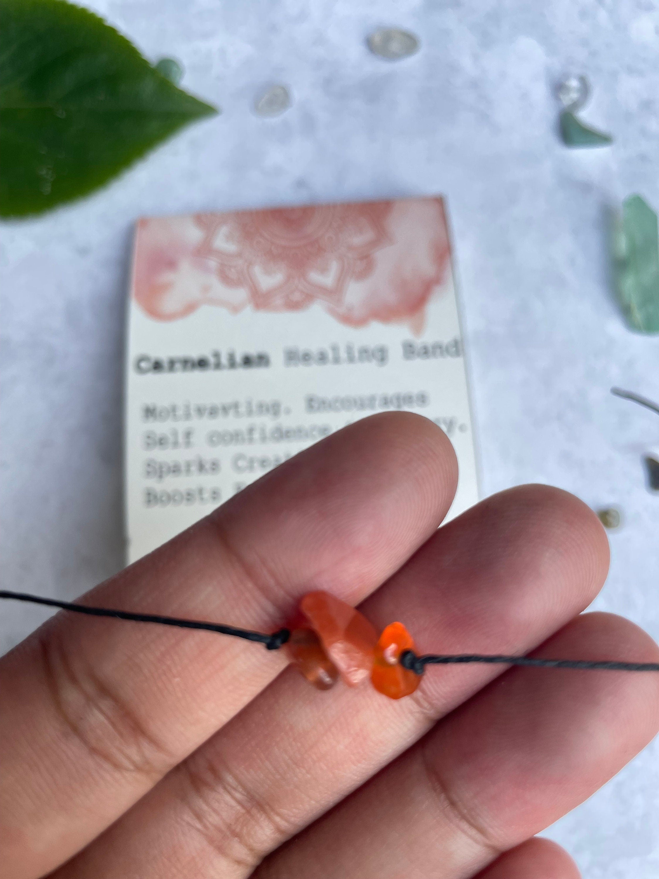 Casual, Boho, everyday gemstone Healing band. Each Bracelet is 10” long and has tie closure. Can be used as an anklet or bracelet. Made of Natural Gemstones . The bands are simple, light weight and with tie closure. The bracelet is meant to be worn at all times till it gets loose or worn out MAKE A WISH Close your eyes & make a wish, then tie this bracelet on your wrist, when the bracelet breaks in two, the wish you made might just come true. Each Bracelet comes with a card with a watercolor Mandala art and healing properties of the crystal (as shown in photo) Healing with Carnelian A stabilising stone, Carnelian restores vitality and motivation, and stimulates creativity. It gives courage, promotes positive life choices, dispels apathy and motivates for success. Carnelian is useful for overcoming abuse of any kind. Each Bracelet is handcrafted and the gemstones are natural & unique so the order, size & shape of the gemstones will differ. ***Disclaimer Healing’ is a general non-medical term used throughout this shop to describe one of the beneficial and energetic properties of natural gemstones. All properties attributed to the gemstones sold on this website are based on ancient folklore and traditional uses. All ‘healing’ or ‘energy’ jewellery sold on this shop is created with the intent to assist with the increase or balancing of subtle energy vibrations within the body. The products and information found here are NOT intended to diagnose, treat or prevent any disease, nor replace professional medical advice.