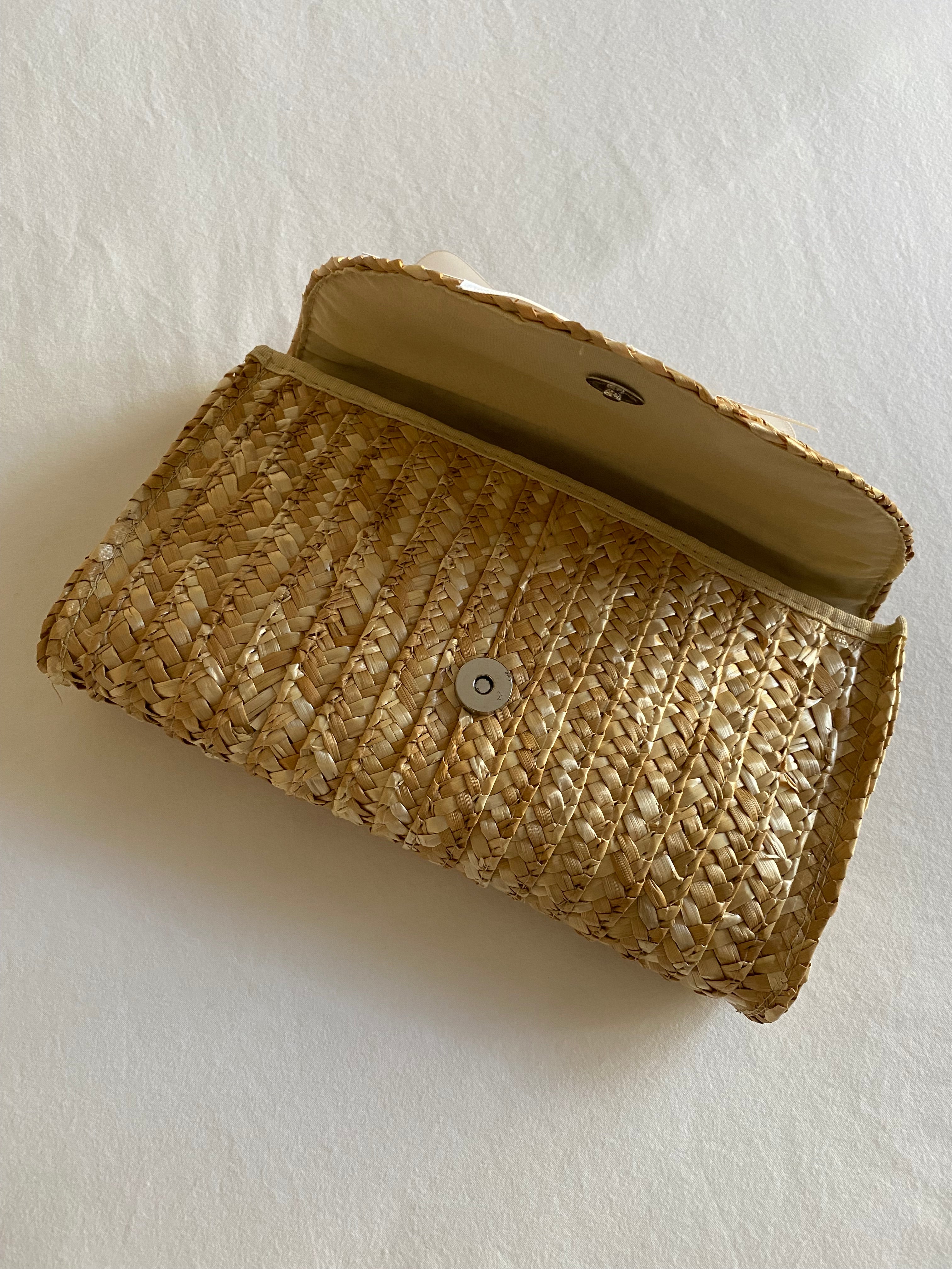 Handmade rattan straw clutch bag with white satin bow and sugar skull patch. Snap closure, the inside...