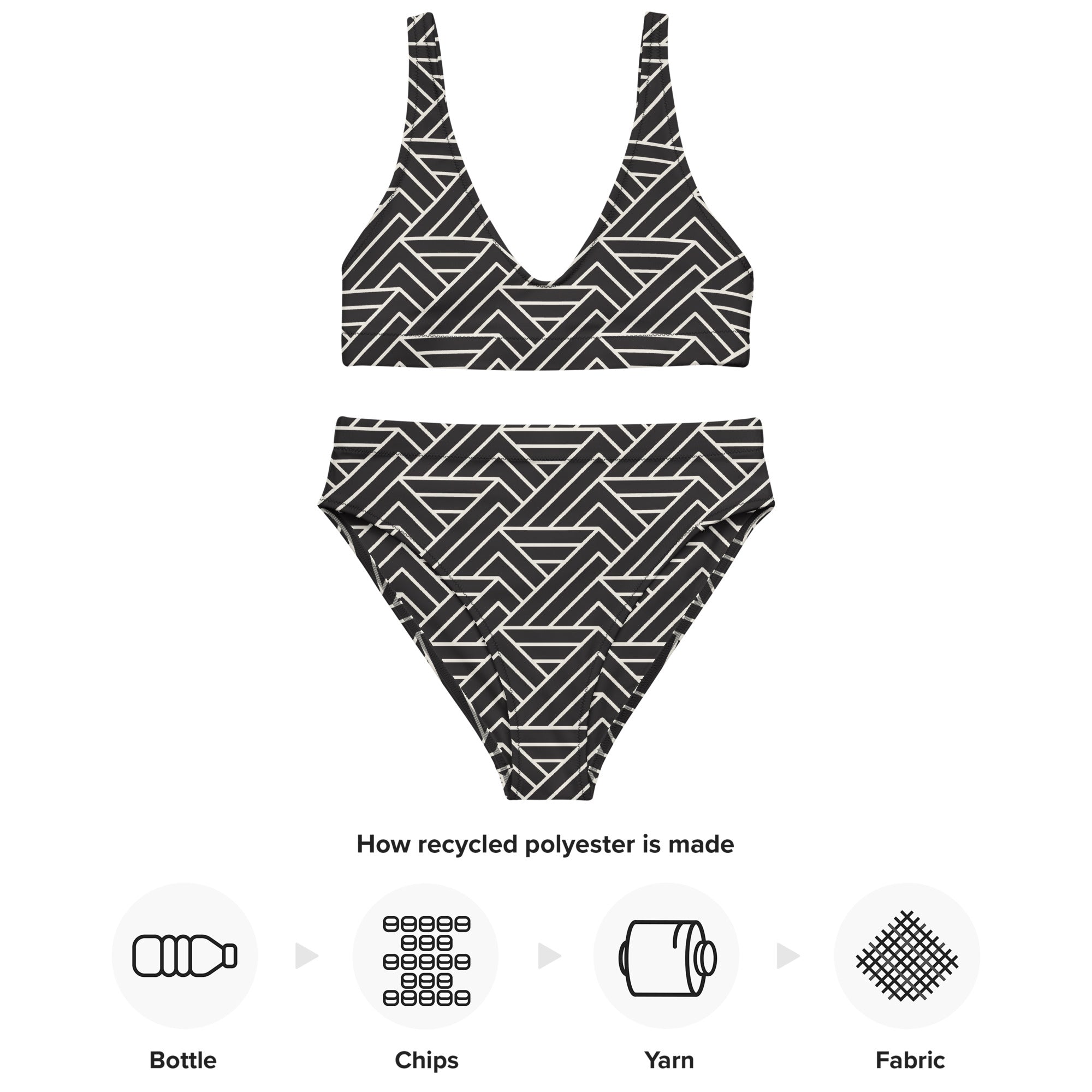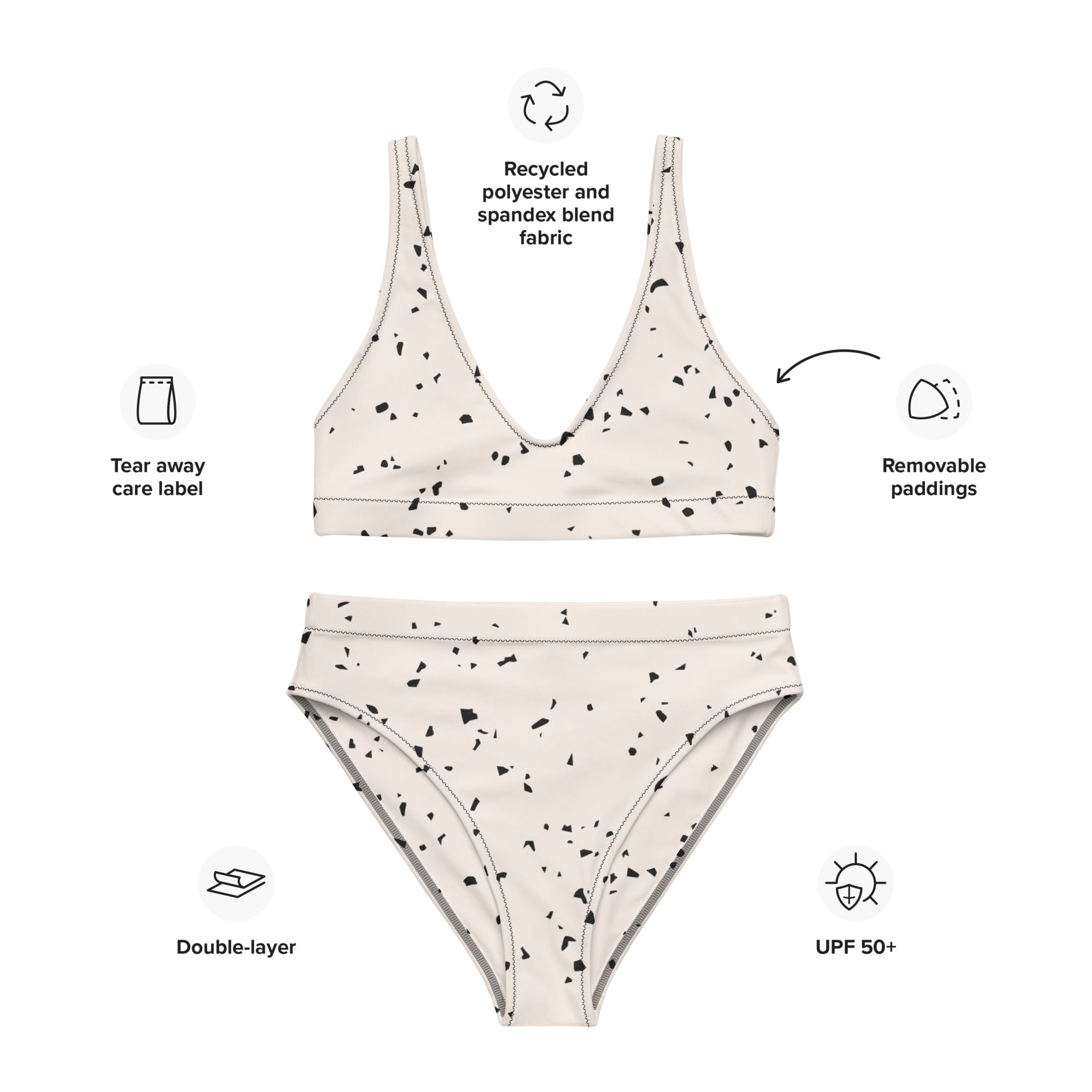 Our All-Over Print Recycled High-Waisted Bikini is destined to become the only swimsuit you want to reach for in your drawer! The bottoms are high-waisted, and the top has removable pads. Both come with a tear-away care label. These features make it comfortable and flattering on many different body types. The only thing this swimwear gem is missing is your beautiful designs. Get it for yourself, a friend, or sell it on your online store.