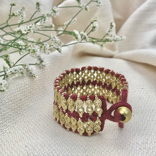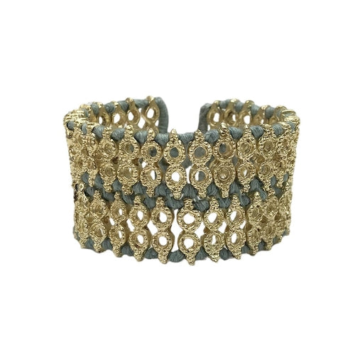 The bold Riya Cuff is anything but understated. The playful motif is created with intricate handwoven metal beads and cotton thread. The perfect statement accessory for day to night and combines traditional Indian designs with modern elegance.