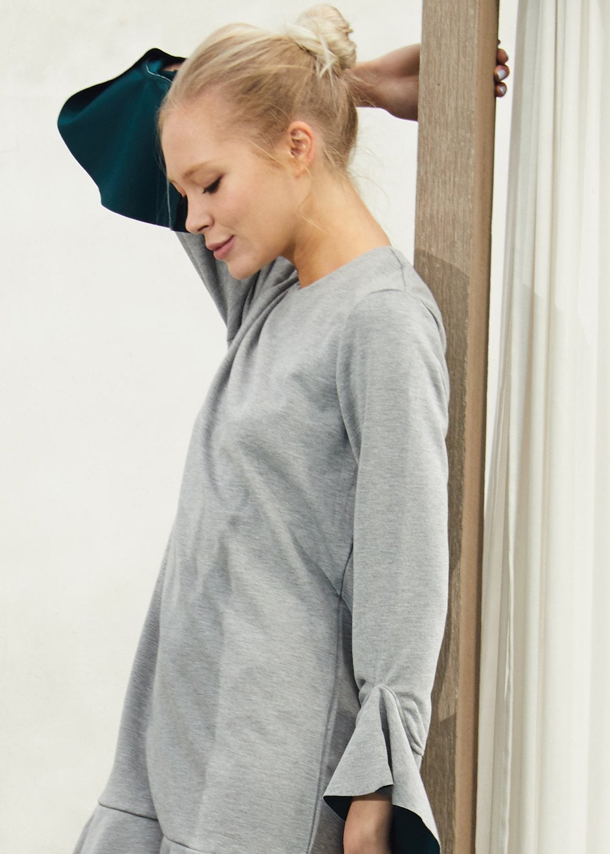 Women's casual crewneck shirt dress with flared bell sleeve.