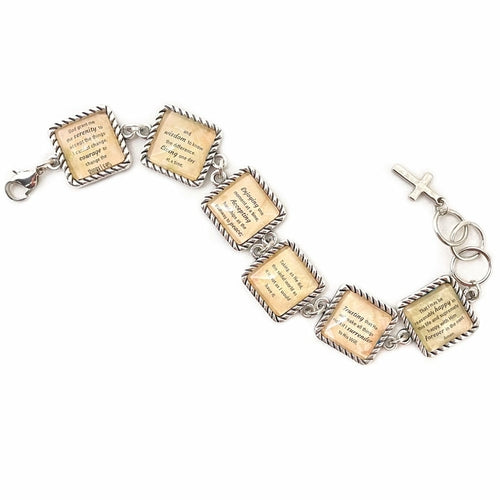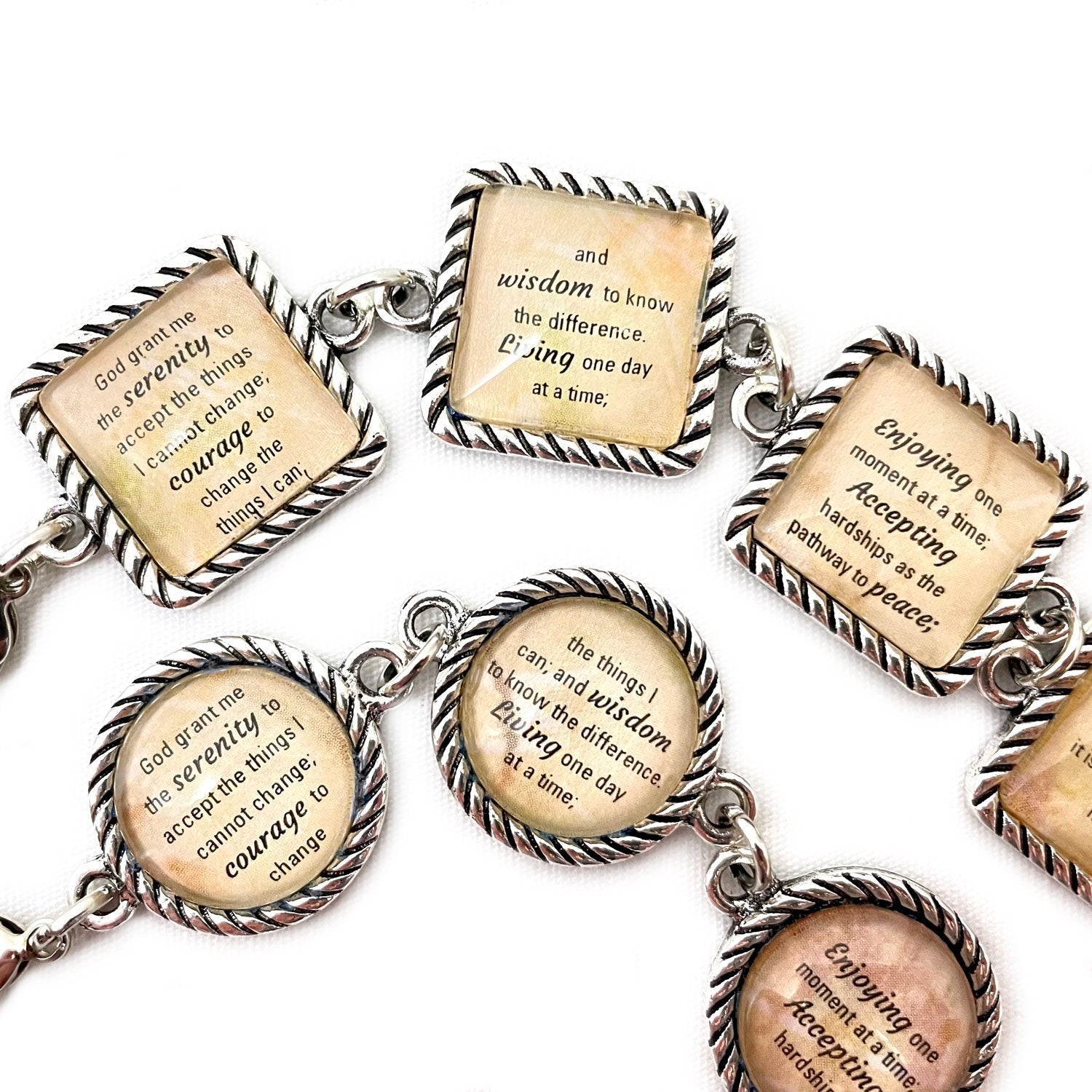 The Serenity Prayer charm bracelet is a beautiful reminder of God's love for us. From facing day-to-day trials, to battling a major life challenge such as loss, illness, or addiction — this prayer offers courage, wisdom, hope, and peace. You or a loved one will cherish this beautiful silver metal and glass bracelet featuring the Serenity Prayer in its entirety on six glass charms: