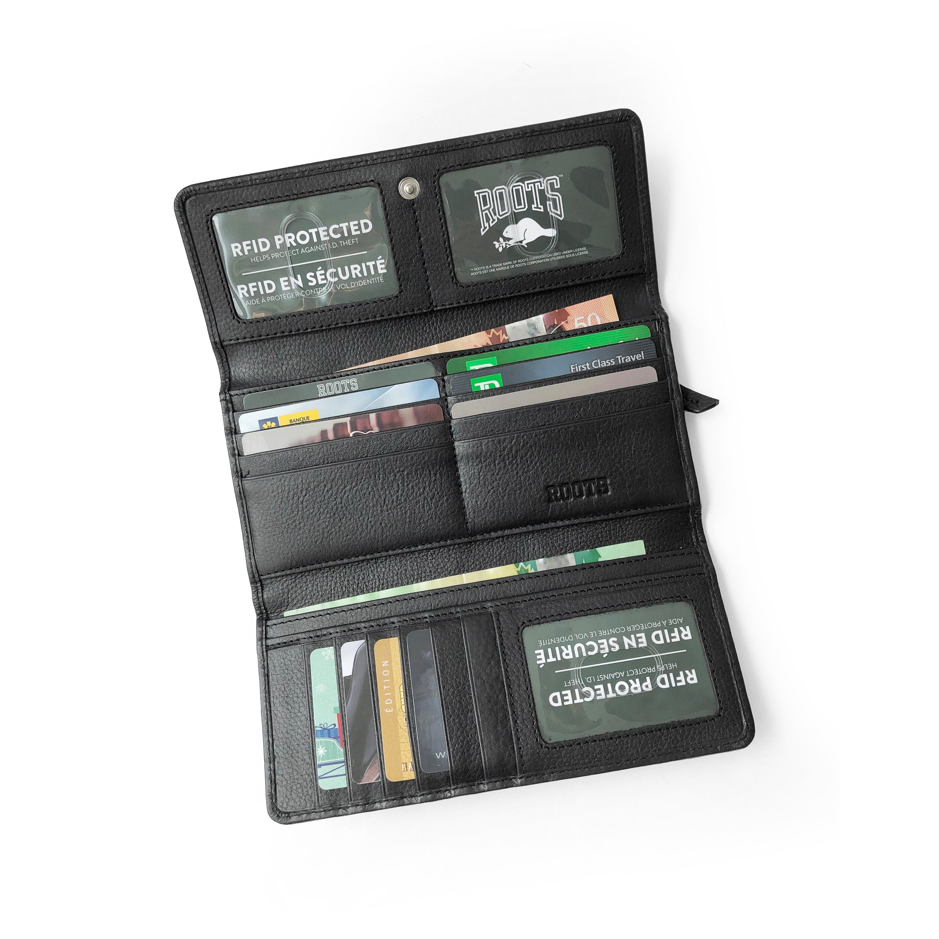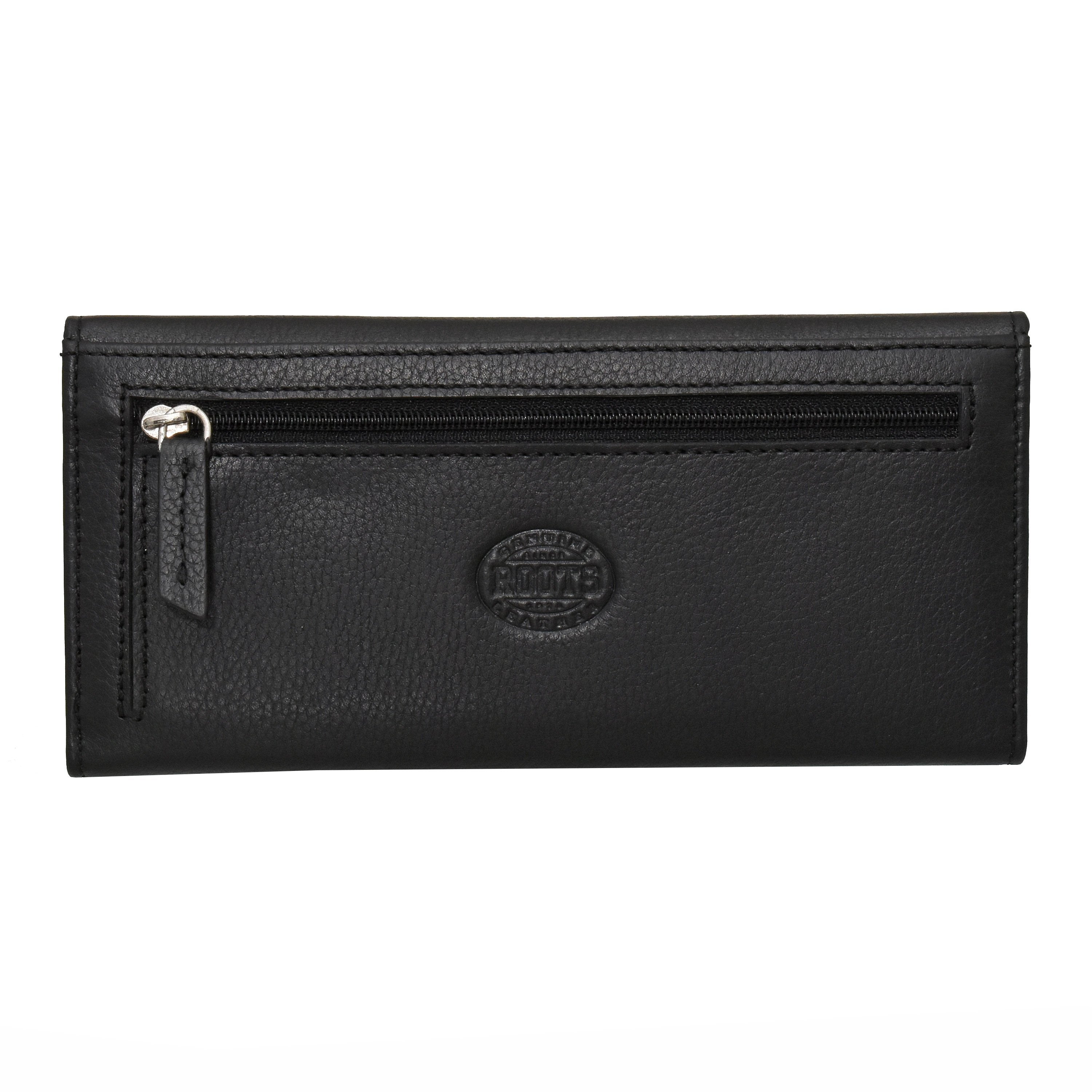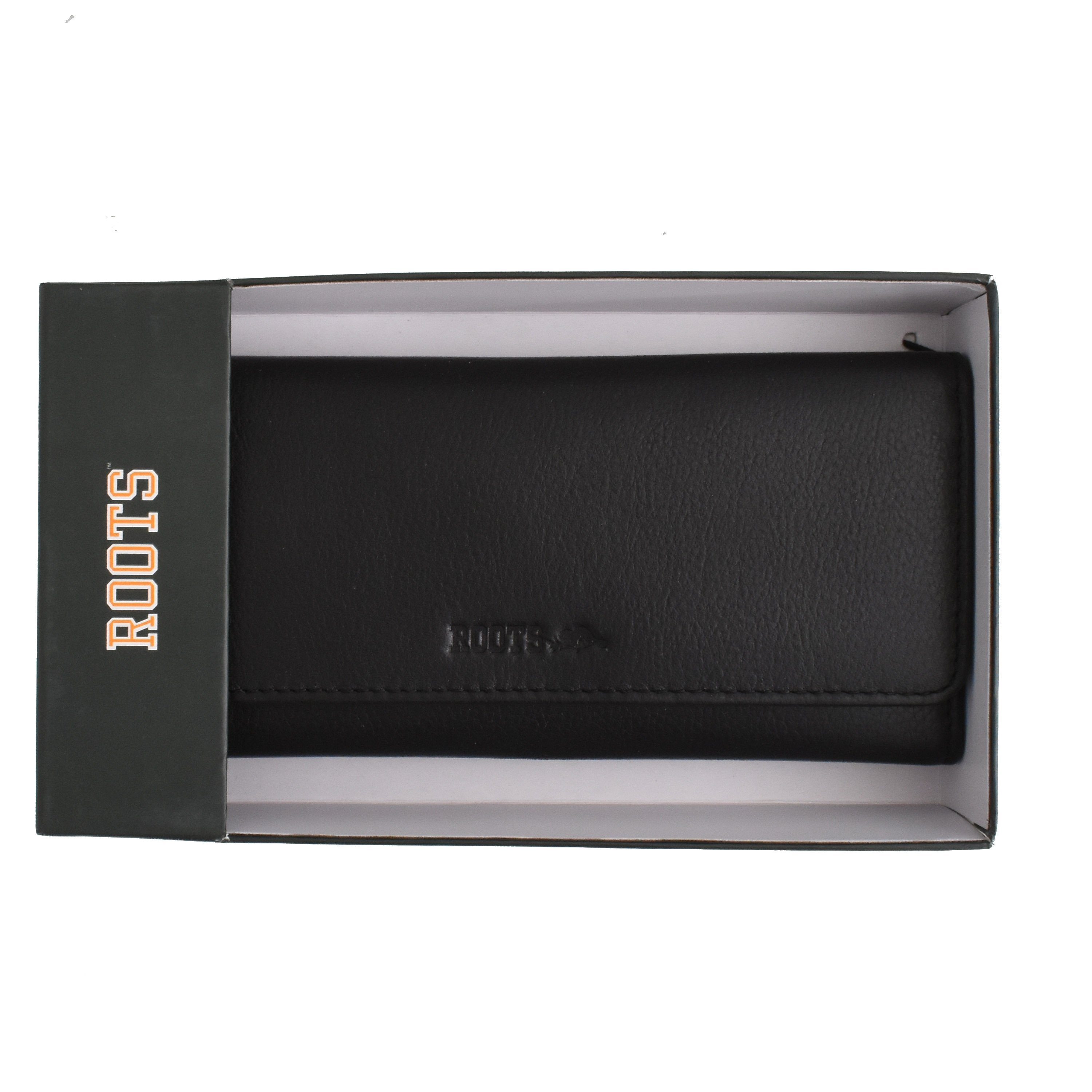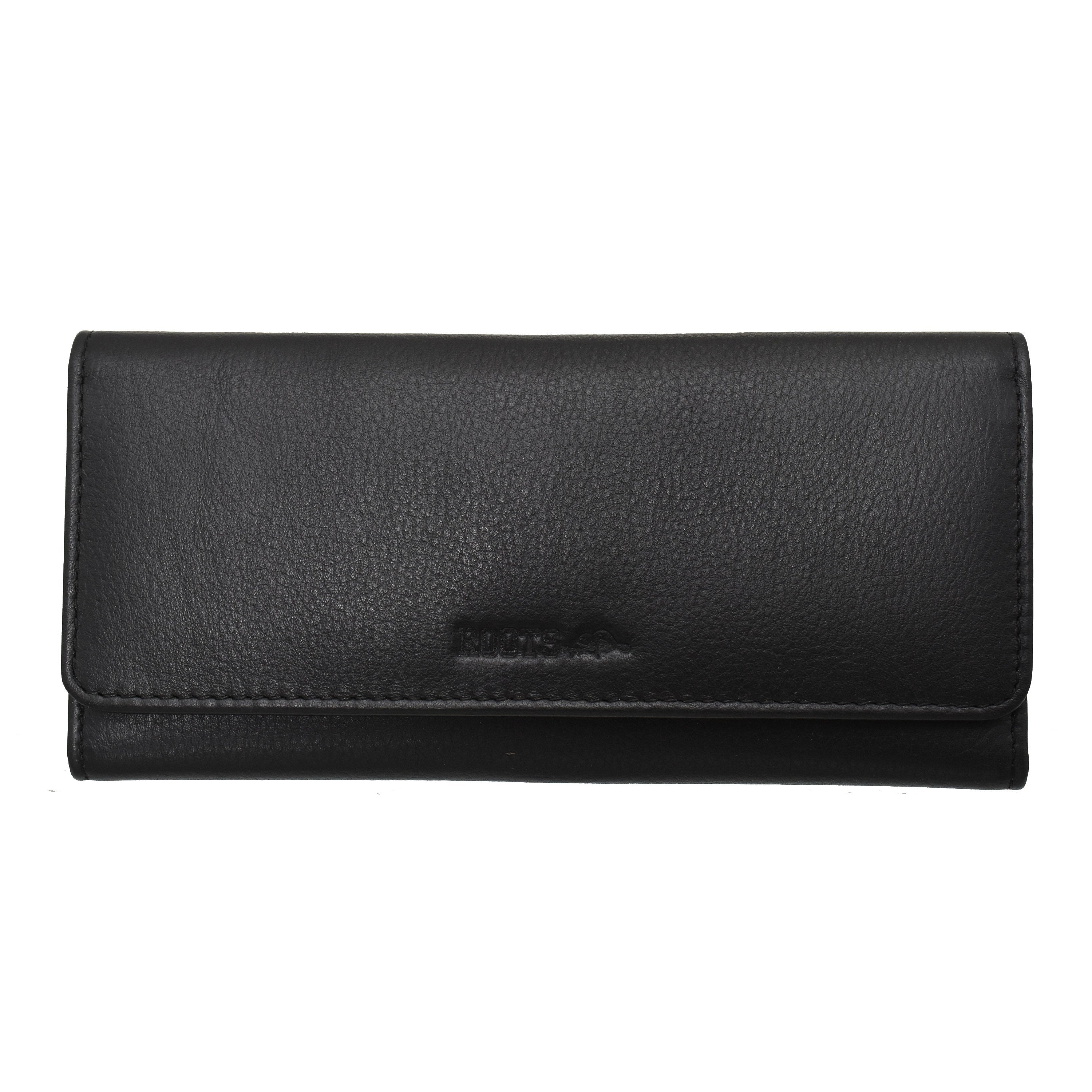 This Roots Slim Clutch is offered in soft touch full grain genuine leather. It can hold up to 28 cards, features multi functional pockets, 3 easy access ID windows and a secured zipper pocket. All of this in a slim, compact and organized wallet.!