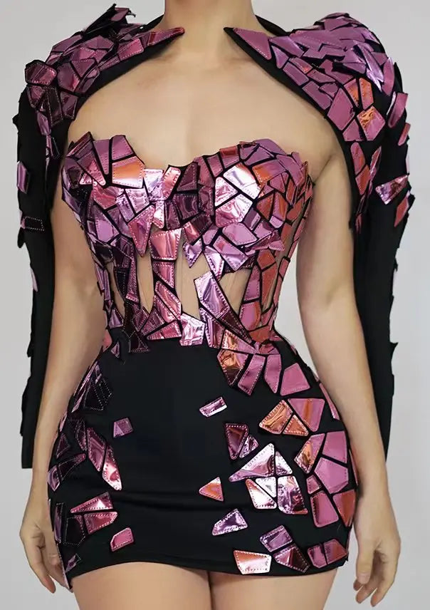 Sparkly Pink Sequins Short Tube Bandage Dress Set Sexy Show Stage Wear Performance Dance Costume Party Birthday Dress Suipian