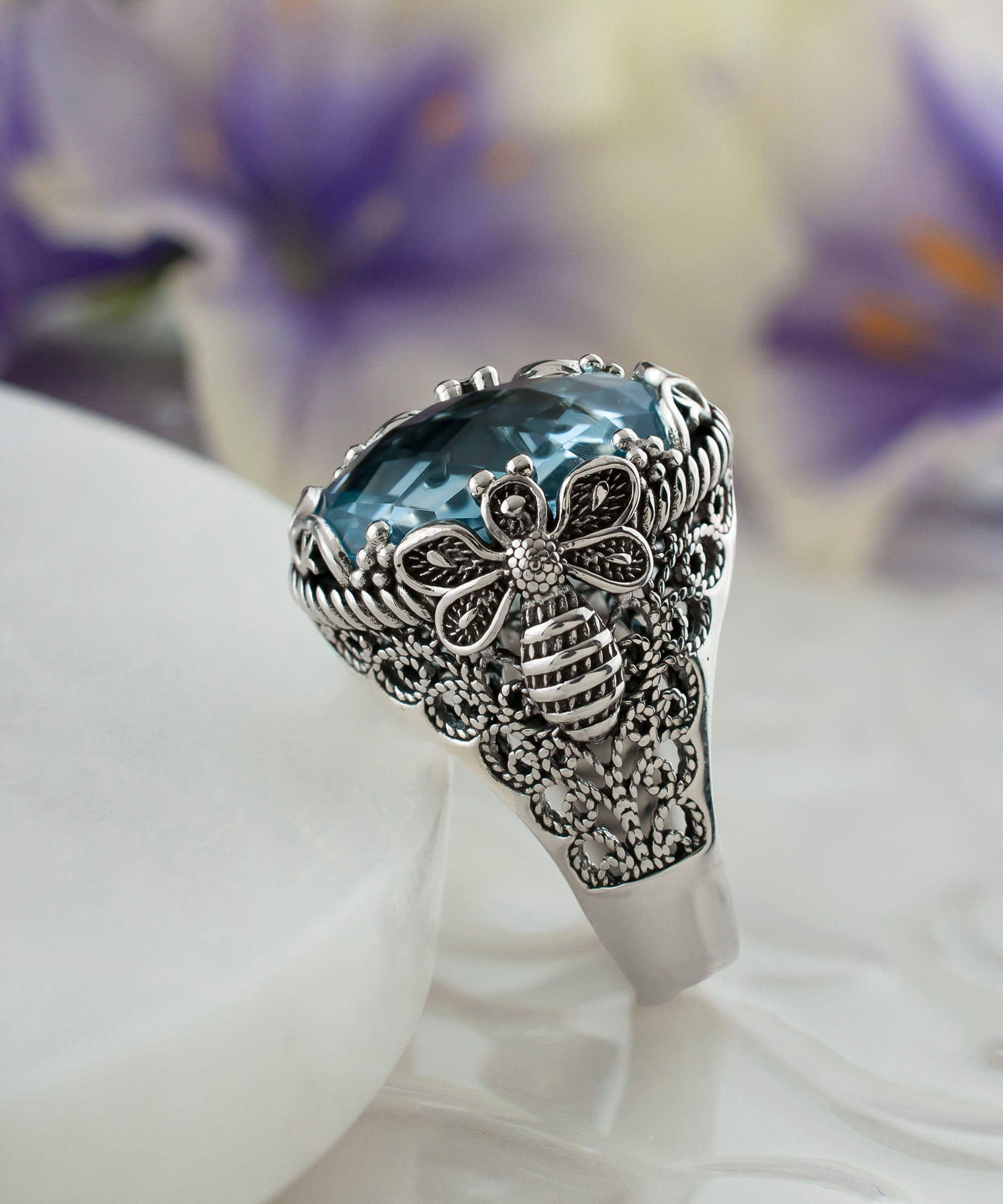 This blue stone ring also has a filigree art bee detailed design that is oxidized and highly polished.