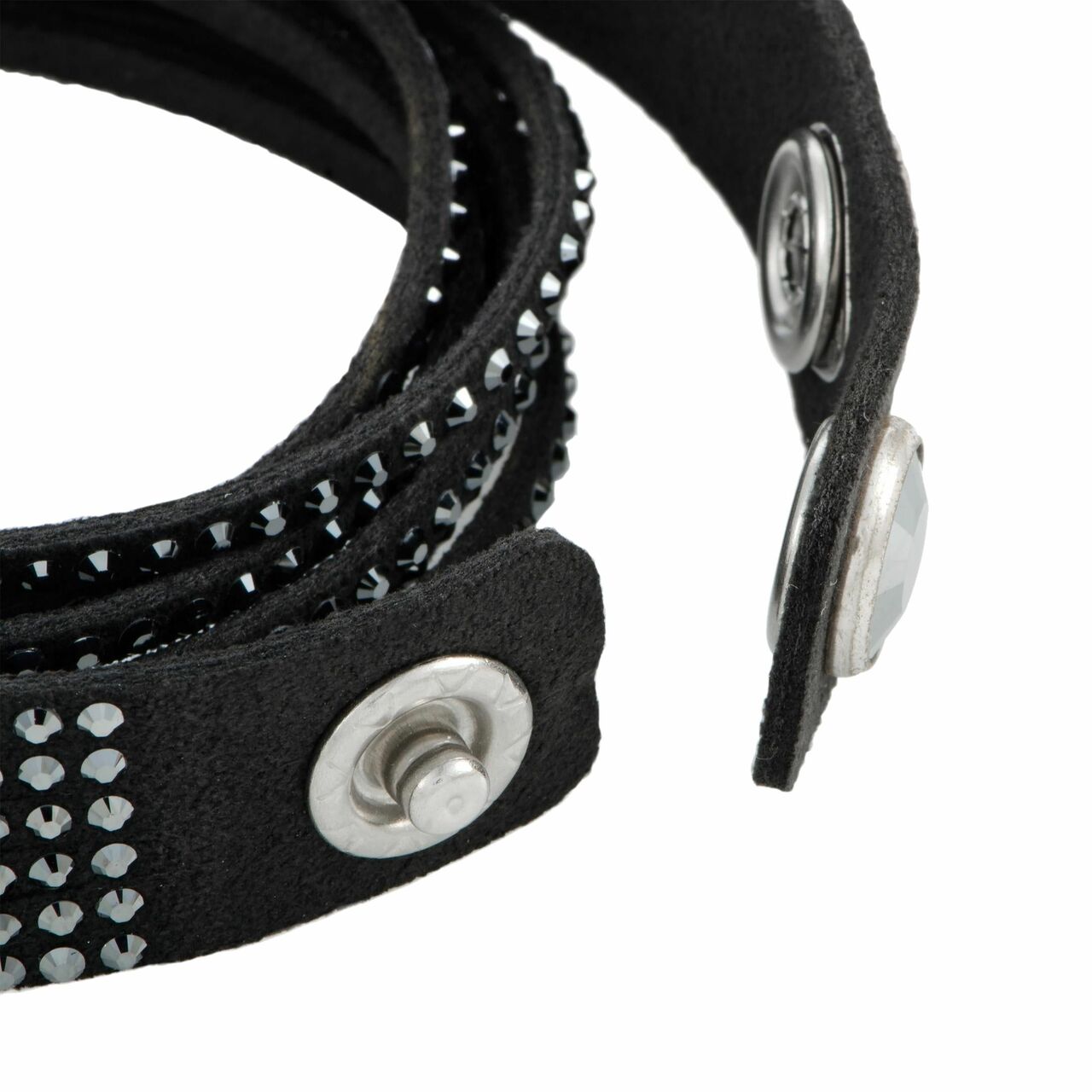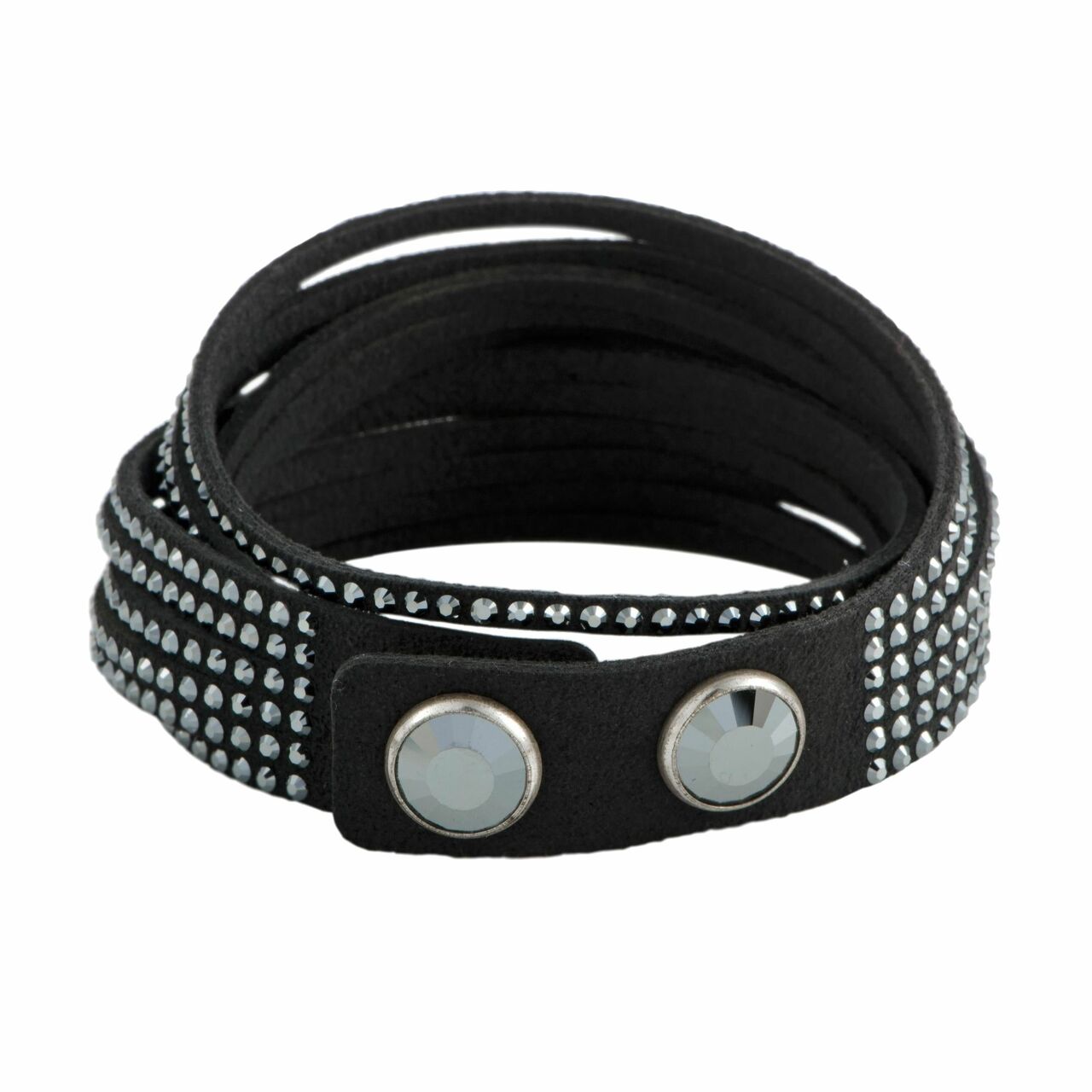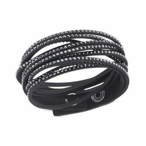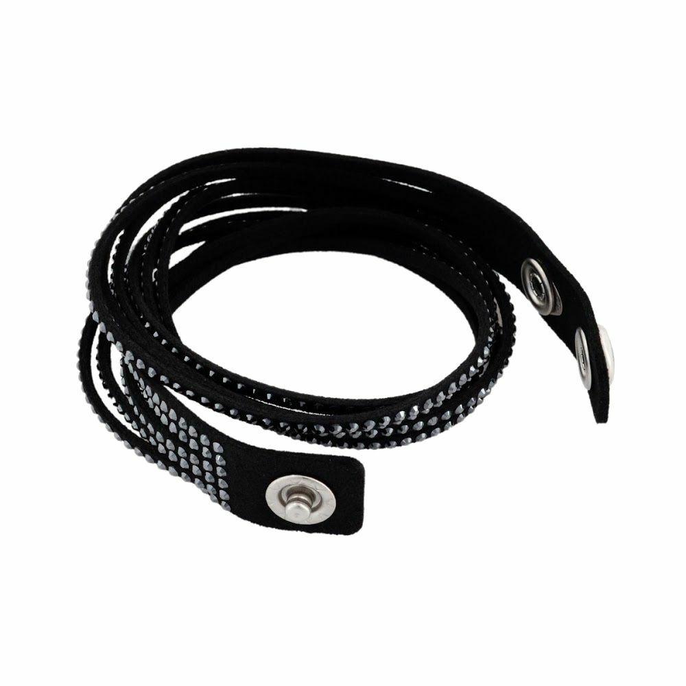 This must-have Swarovski 1179237 Slake Black Rhodium-Plated Women's Crystal Wrap Bracelet is easy to wear with virtually any outfit! Glittering with Jet Hematite crystals on black microfiber, it wraps comfortably around your wrist for a twisted look. The closure consists of two clear crystal buttons, allowing you to adjust the size. Embellished with a plethora of exquisitely cut crystals, this extraordinarily envisioned bracelet offers an incredibly stylish appearance that will add an attractive, edgy twist to any outfit of yours. The bracelet is presented by Swarovski and weighs 10 grams.