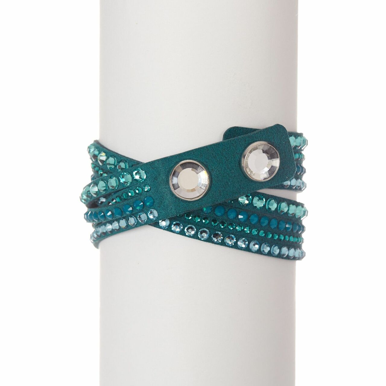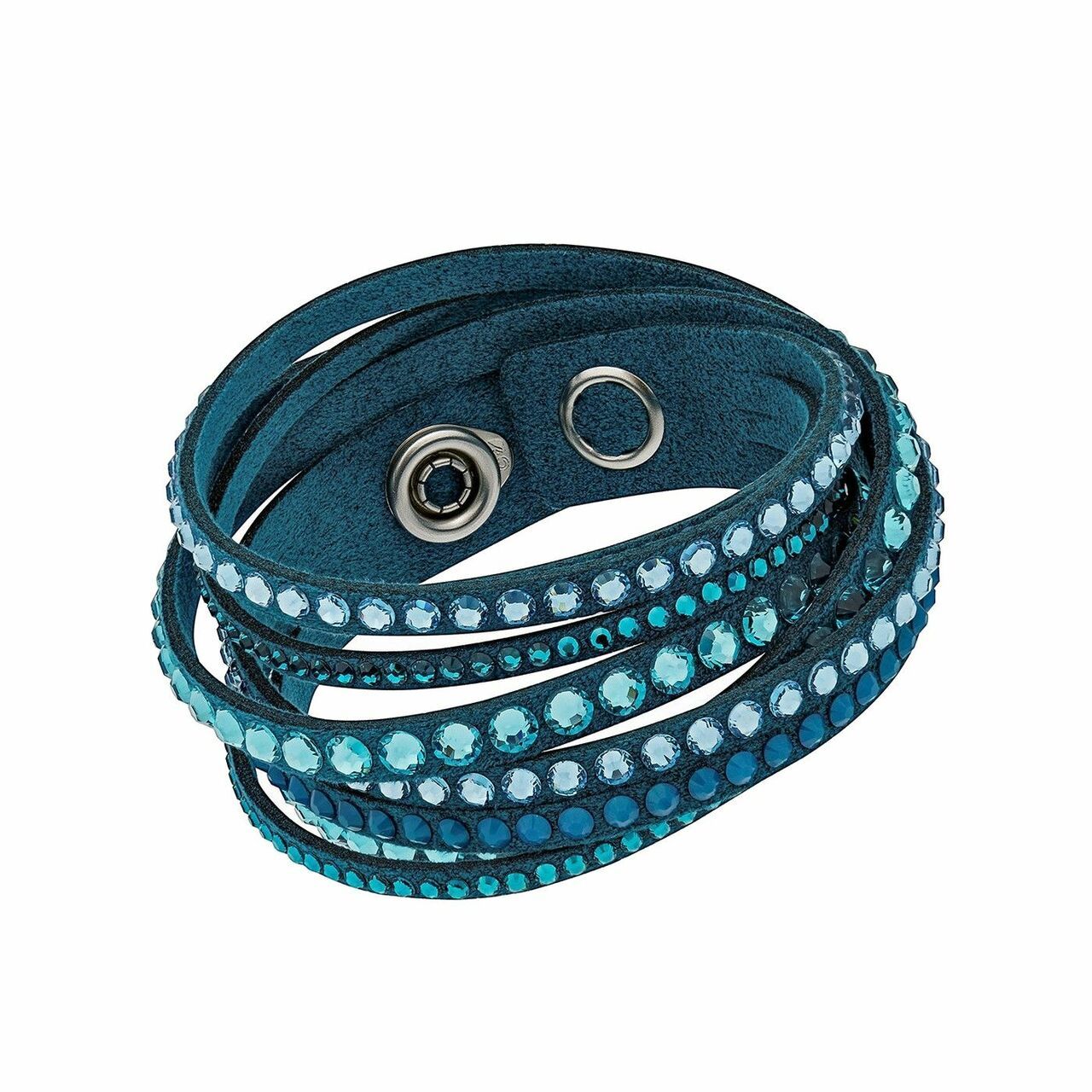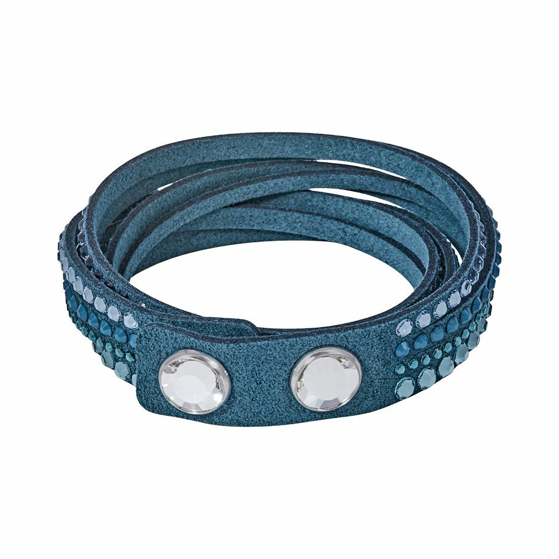 A Swarovski 5043496 Slake Blue Alcantara Women's Crystal Accented Wrap Deluxe Bracelet styled in blue micro-fiber, set with Jet Hematite crystals all around for a multi-faceted sparkle effect. The closure featured two clear crystal snap buttons you can set to adjust to a size that is most comfortable for you.