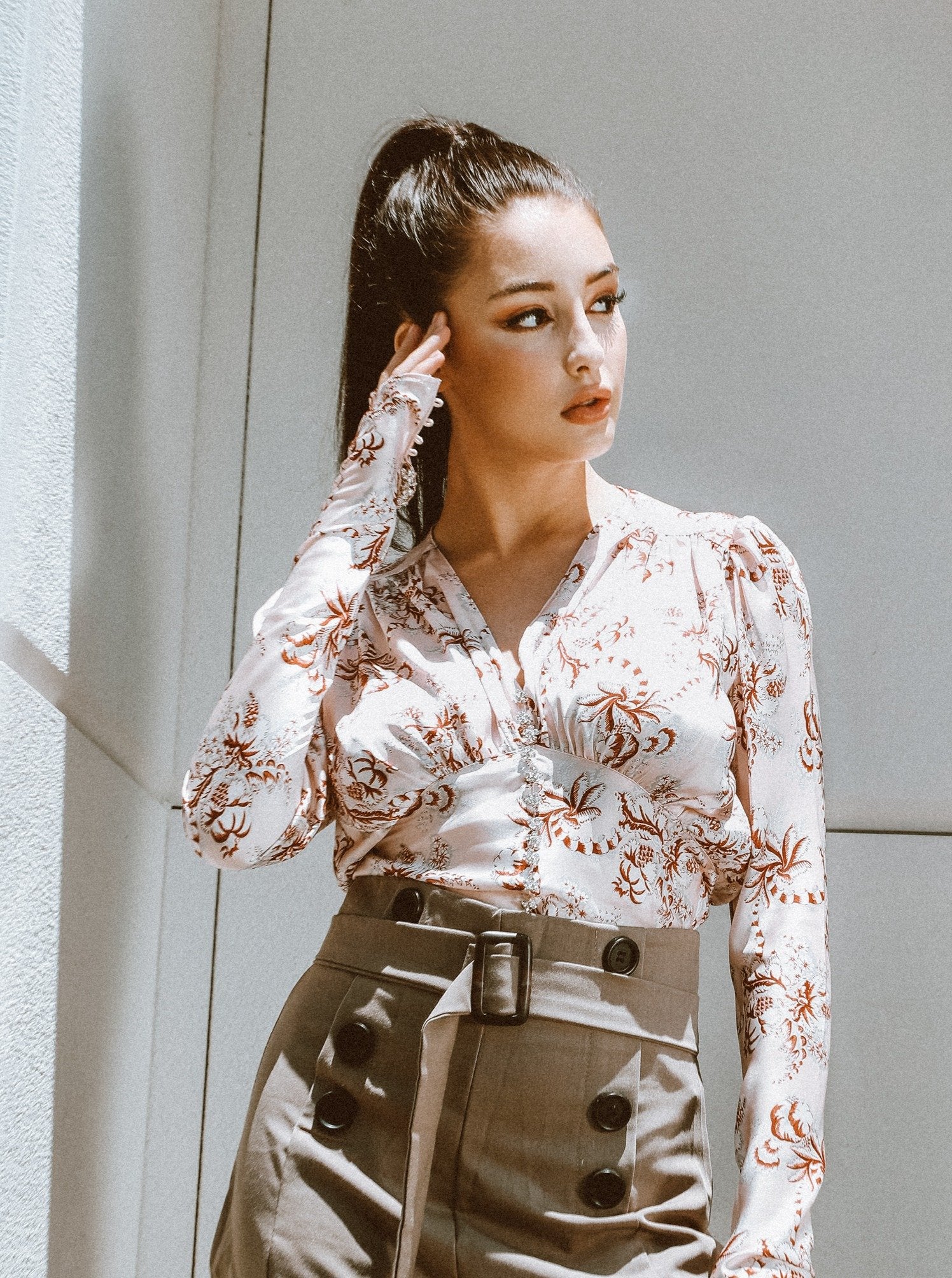 Description: Looking for a feminine blouse that’s effortlessly stylish and so easy to wear? This gorgeous satin blouse checks all the boxes. The plunging neckline leads into gemstone buttons, while subtle gathering on the shoulders and throughout the bodice creates a soft, romantic feel. It’s patterned with a pretty floral print, which means it effortlessly pairs well for work or play—just add cropped trousers or your favorite high-waisted jeans.