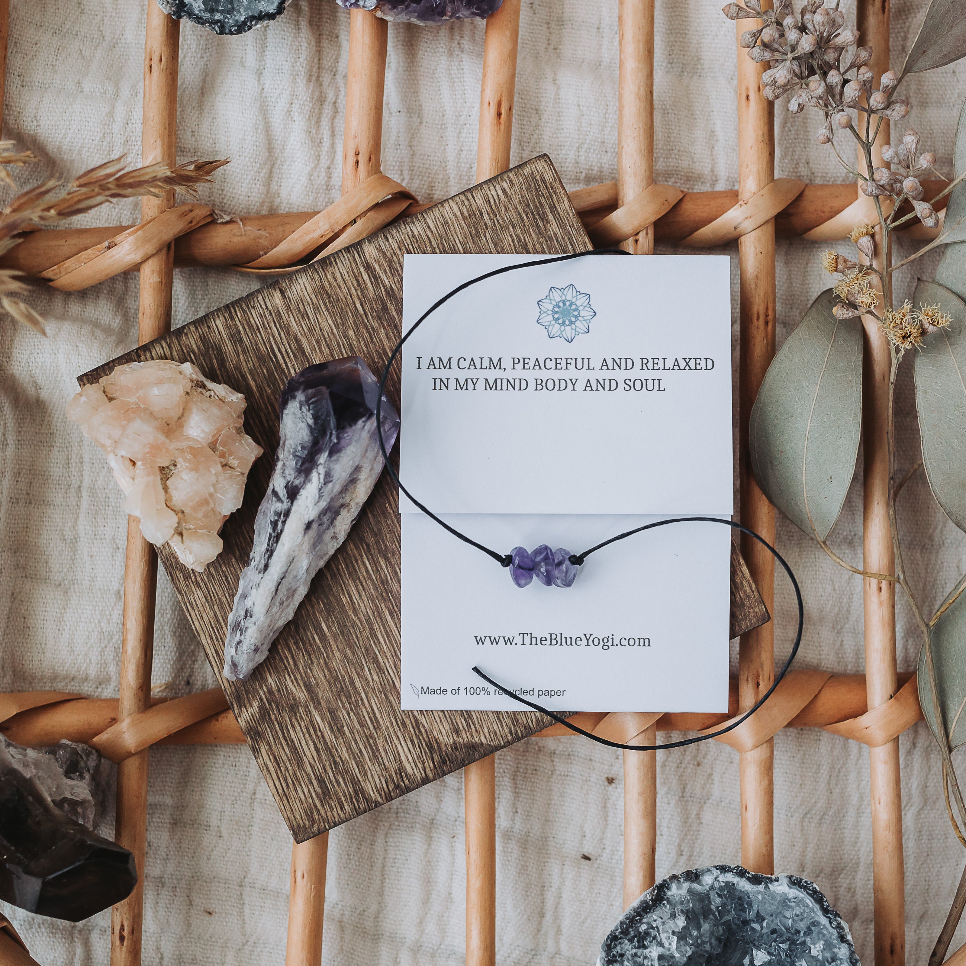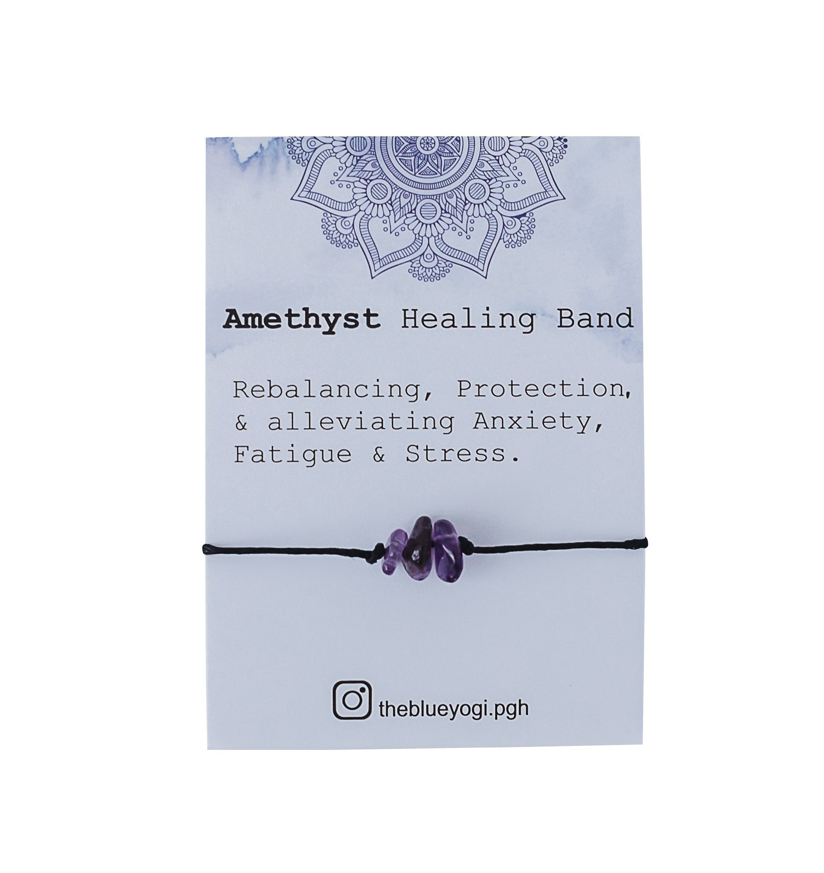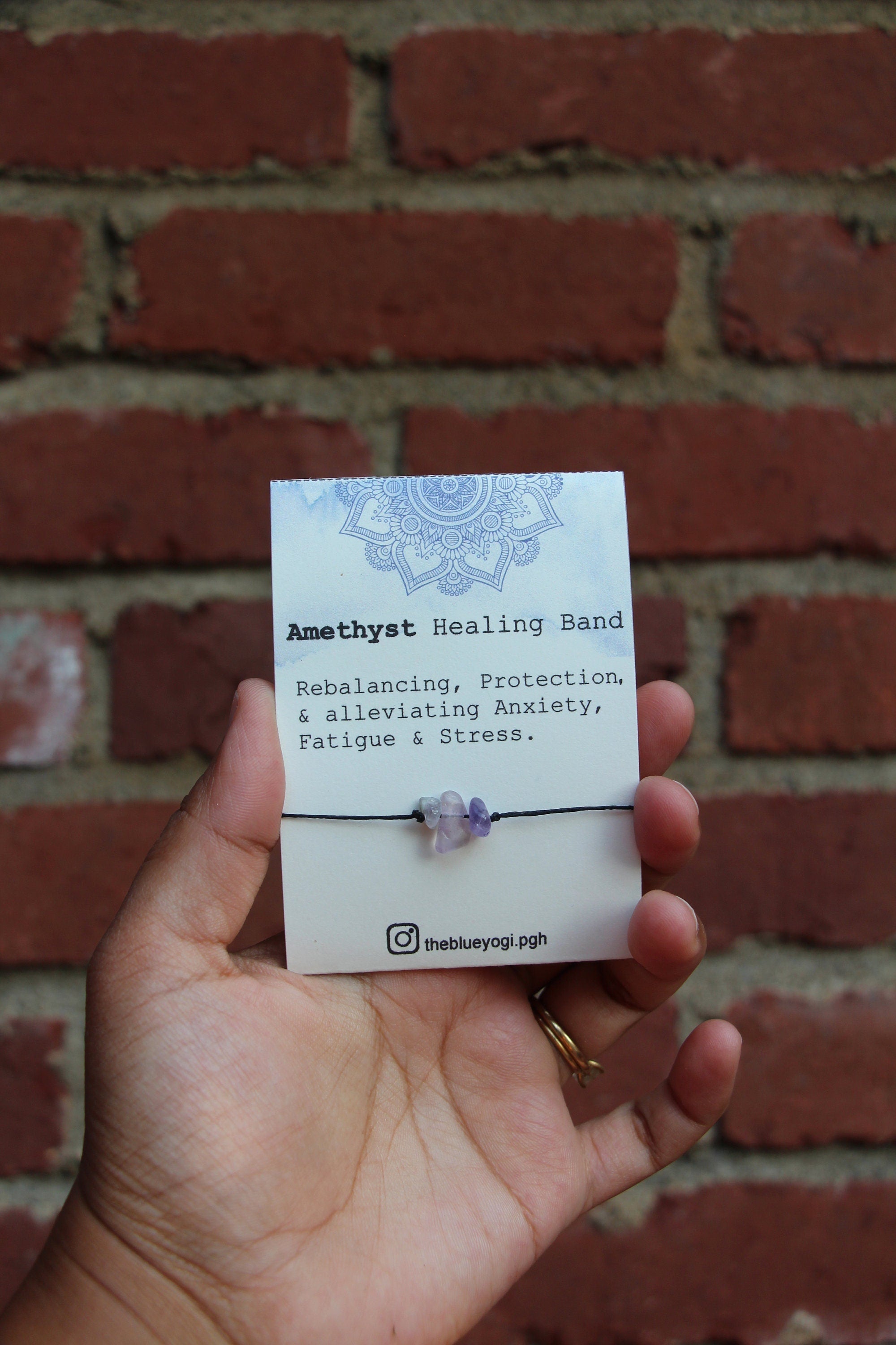Casual, Boho, everyday gemstone Healing band. Each Bracelet is 10” long and has tie closure. Can be used as an anklet or bracelet. Made of Natural Amethyst The healing bands are meant to be worn 24x7. It is safe to wear while showering, sleeping ’t contain any metals just natural gemstones and cord. The bands are simple, light weight and with tie closure so it is safe to wear it all the time and by all ages. Tie the bracelet with a couple of tight knots, snip of the extra cord. Each Bracelet comes with a card with a watercolor Mandala art and healing properties of the crystal (as shown in photo) Healing with Amethyst Amethyst is a natural tranquiliser, it relieves stress and strain, soothes irritability, balances mood swings, dispels anger, rage, fear and anxiety. Alleviates sadness and grief, and dissolves negativity. Amethyst activates spiritual awareness, opens intuition and enhances psychic abilities.