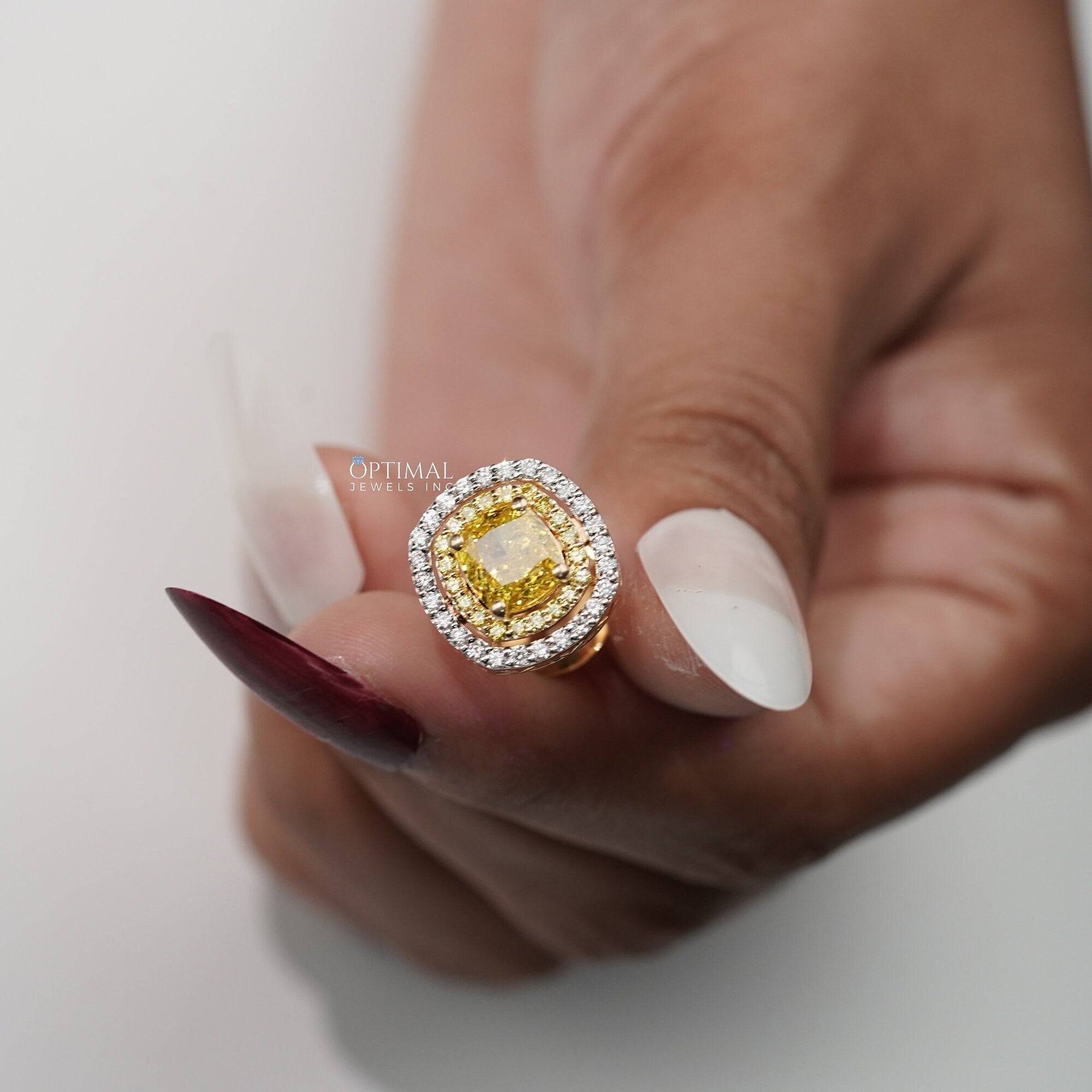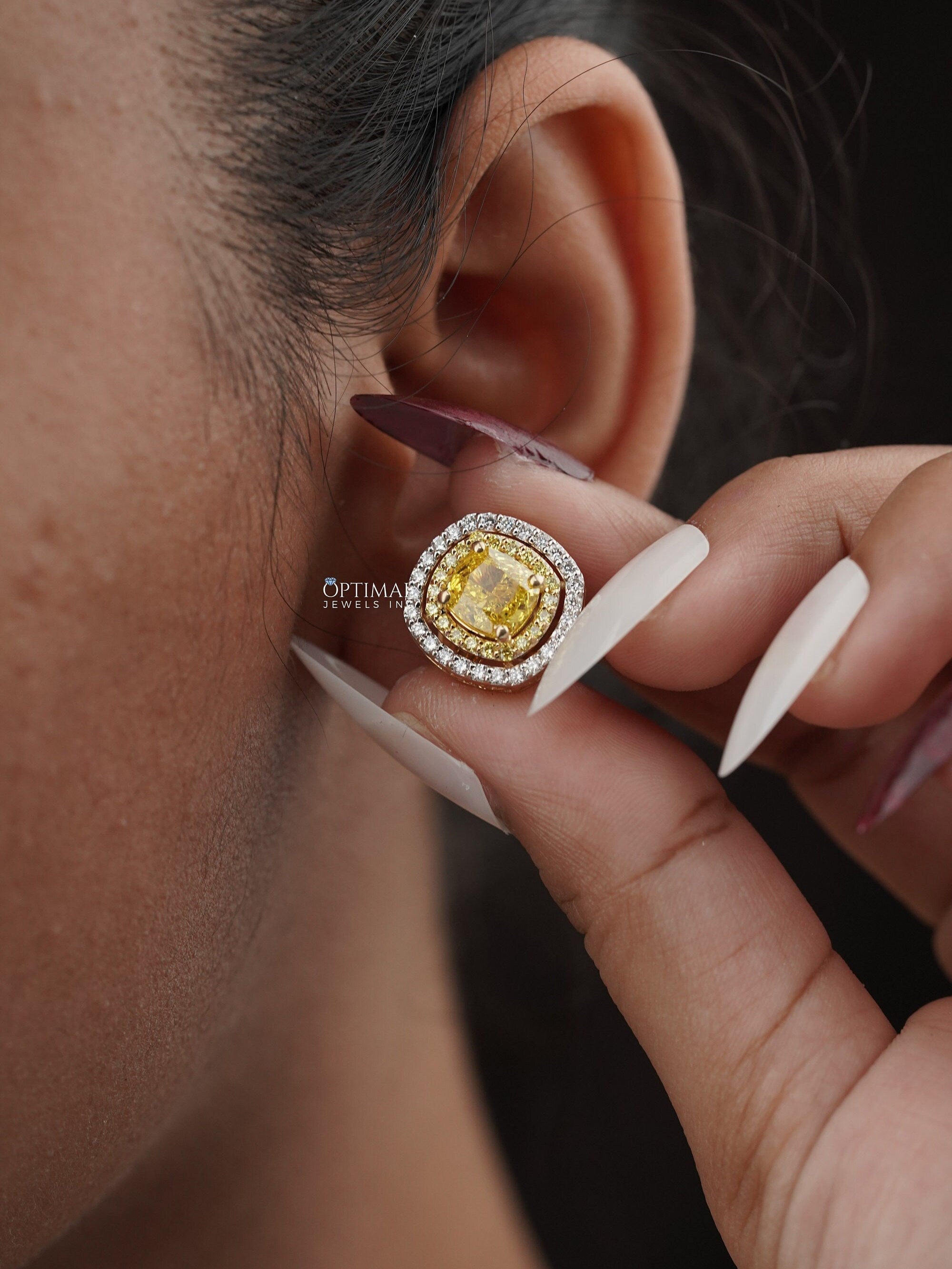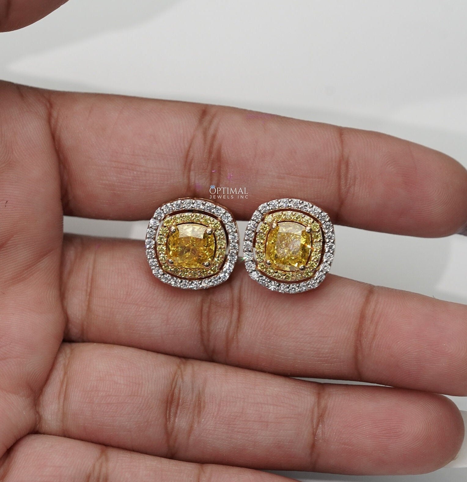 Unique Cushion Lab Grown Diamond Earring 3.50 Ctw Double Halo Diamond Earring 18K Gold Wedding Earring Yellow Diamond Stud Earring For Women