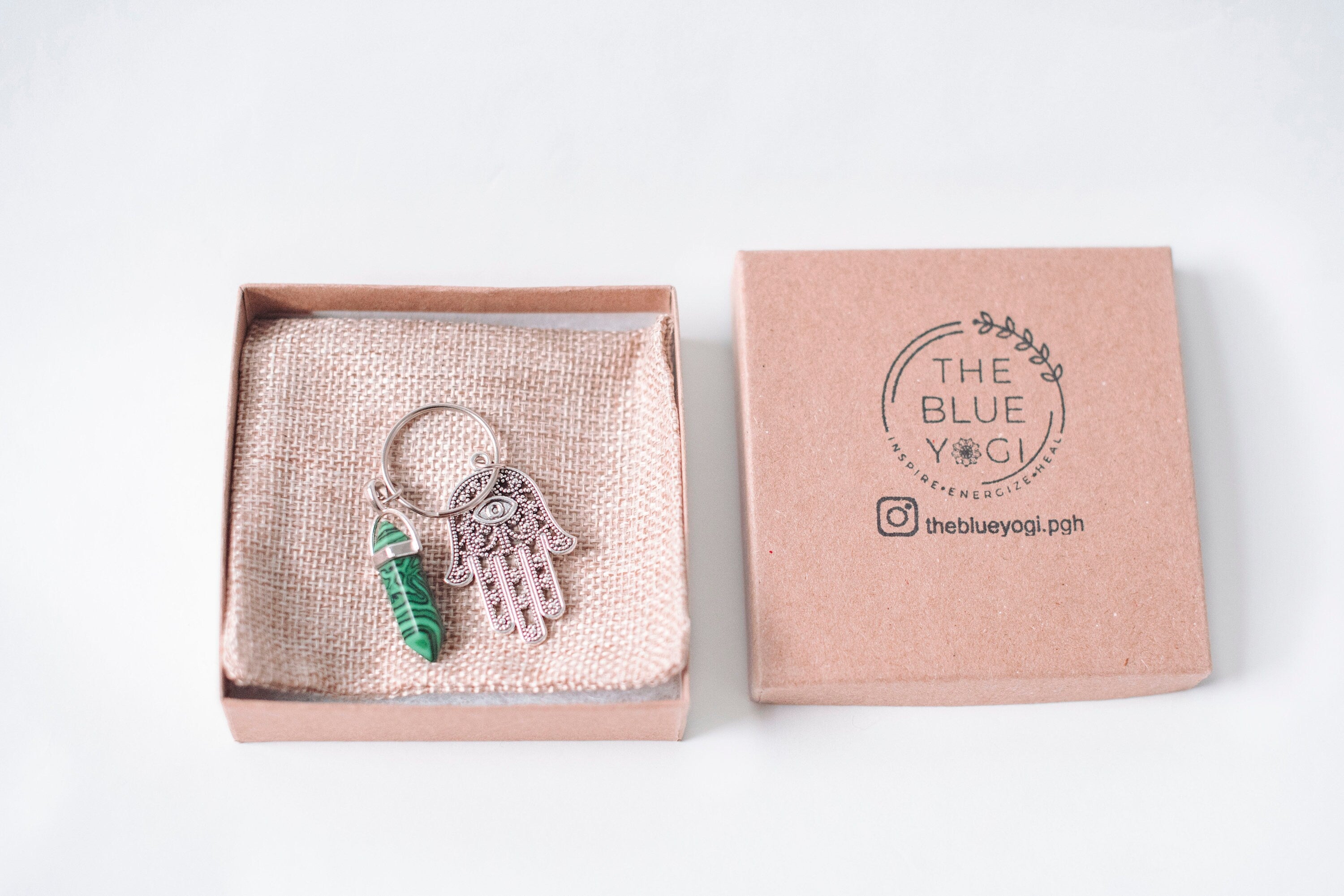 Malachite Hexagonal with Hamsa Charm Keychain. size: about 2.5" long Hamsa and Malachite Key chain that comes with a Hamsa Prayer Card. Great gifts for the believers!