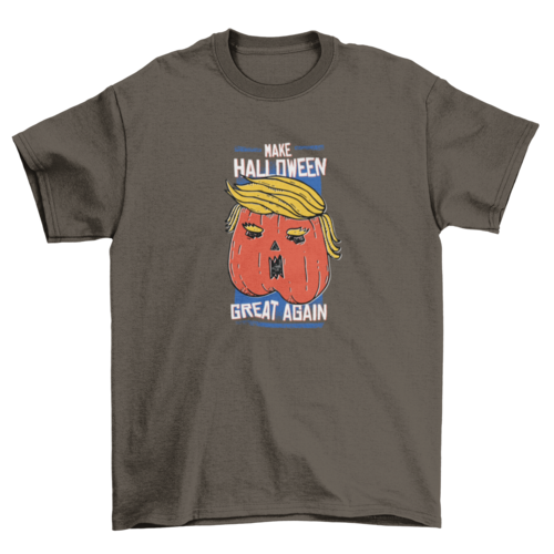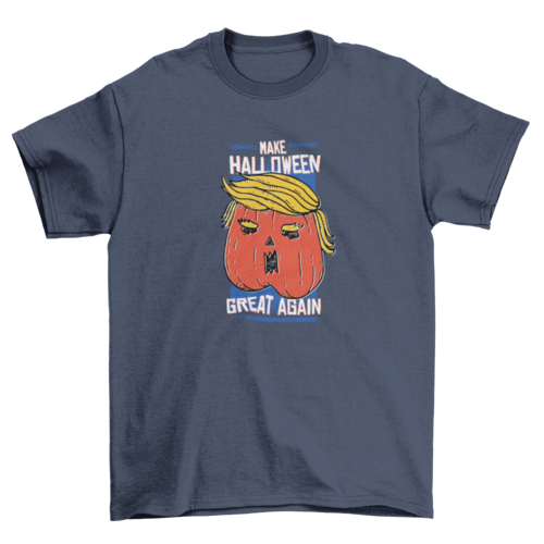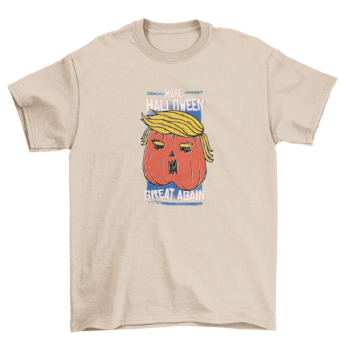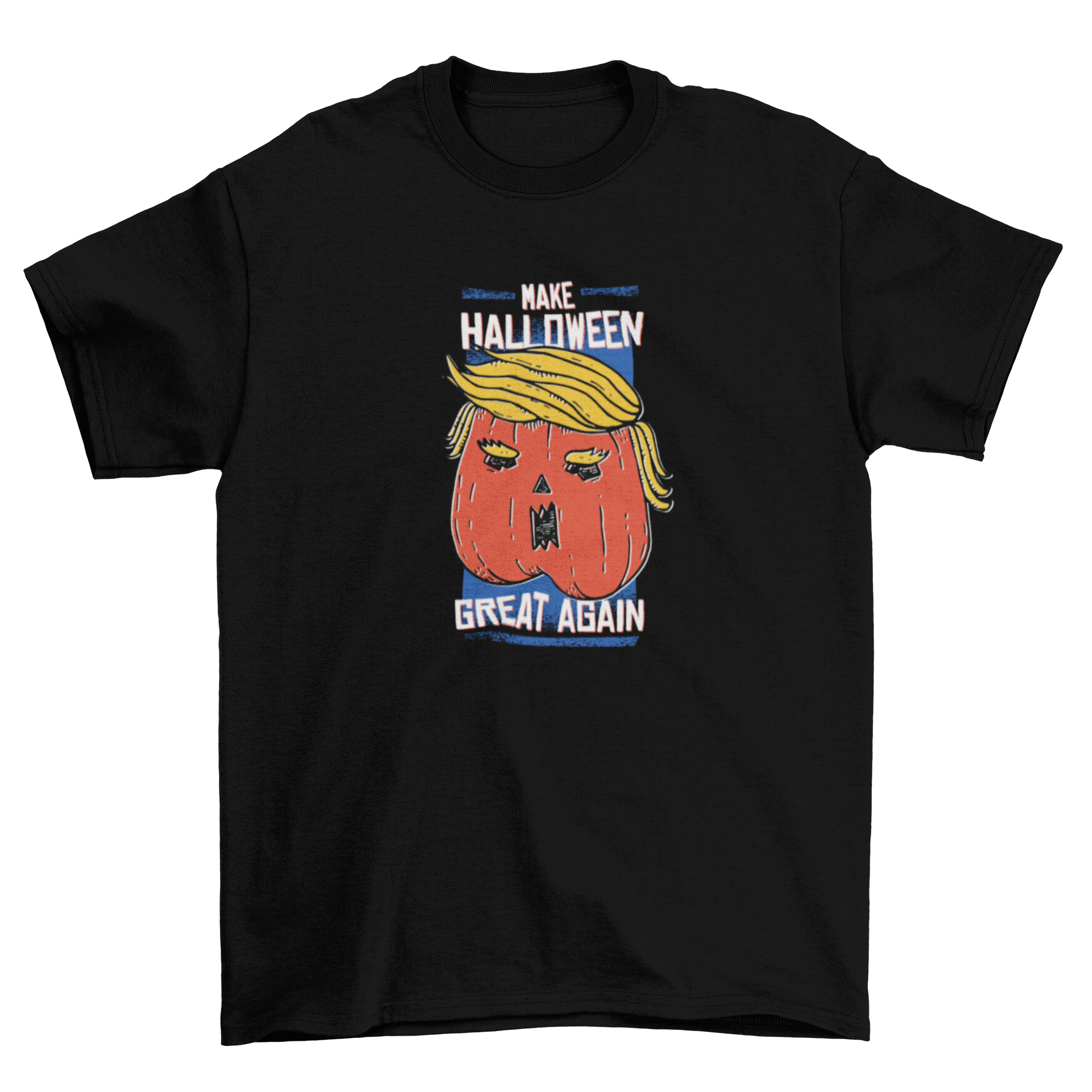 Trumpkin Halloween Pumpkin T-shirt Design showing a pumpkin styled like Donald Trump saying MAKE HALLOWEEN GREAT AGAIN.