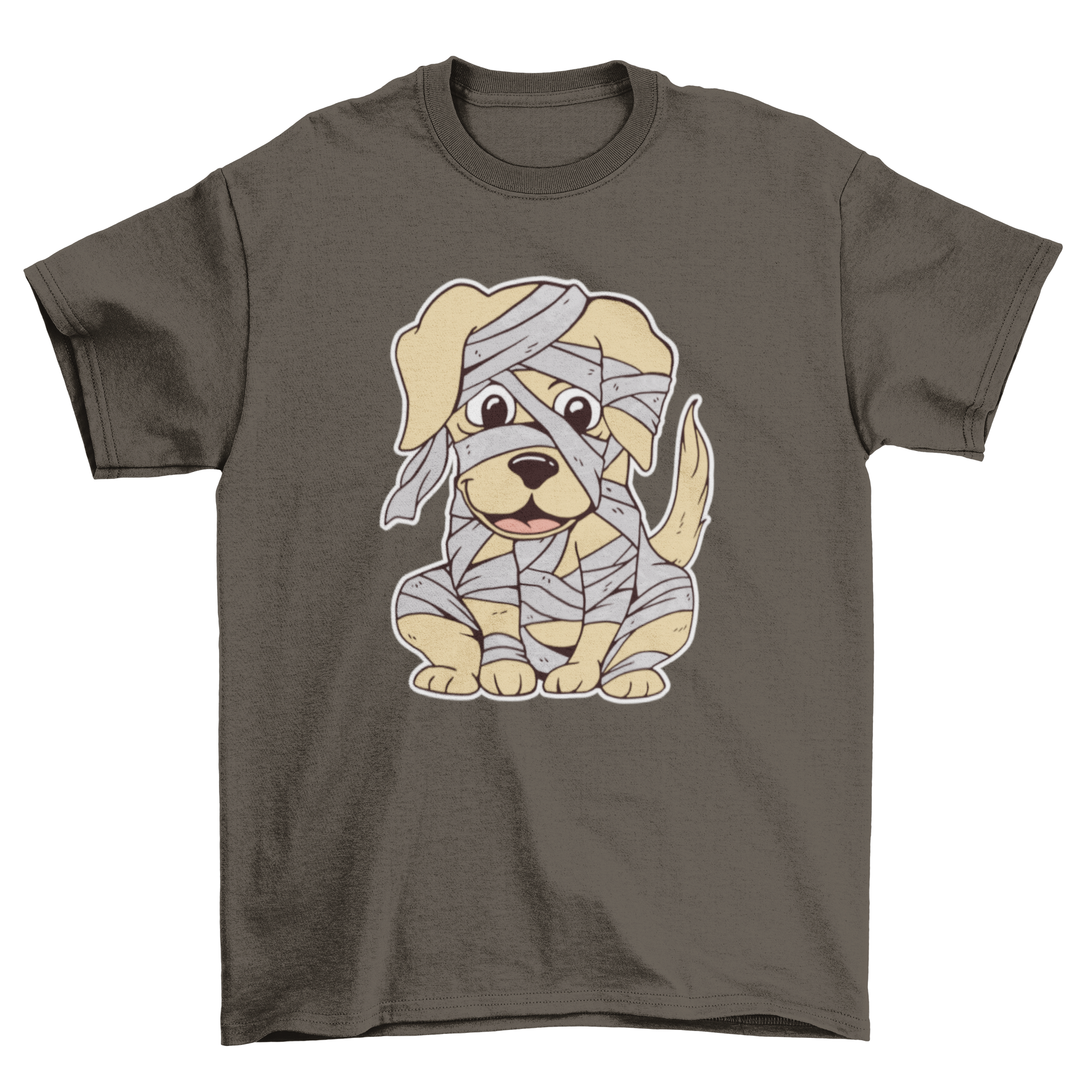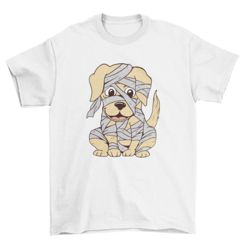 Cute t-shirt design featuring a dog wrapped in mummy bandages.