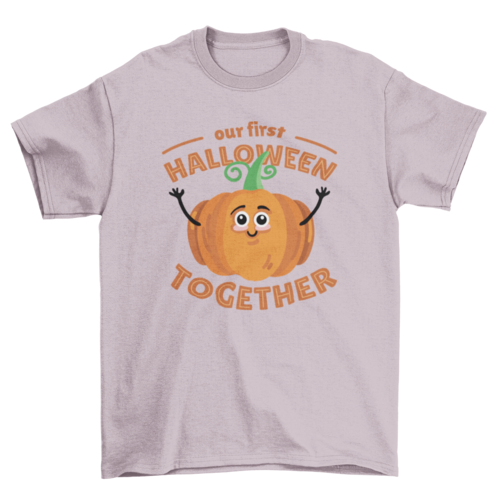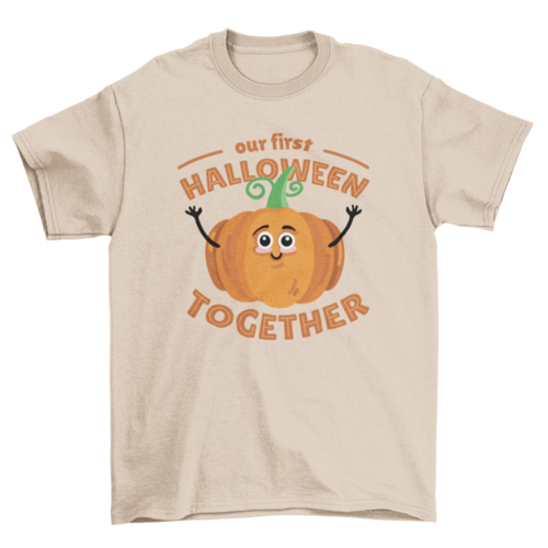 Cute t-shirt design that features an illustration of a cute pumpkin and the quote "Our first halloween together".