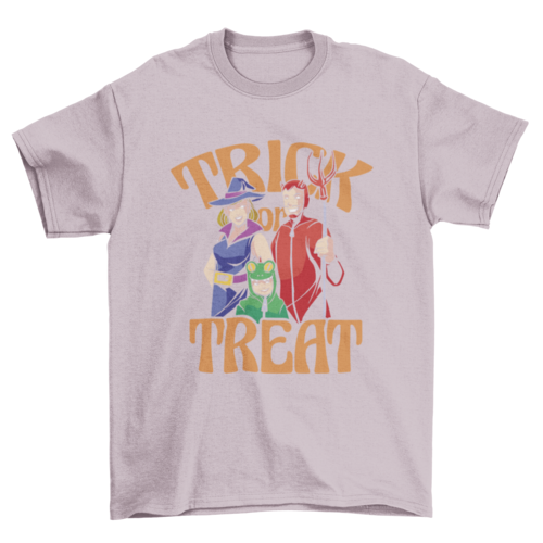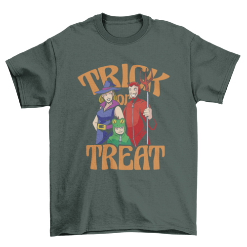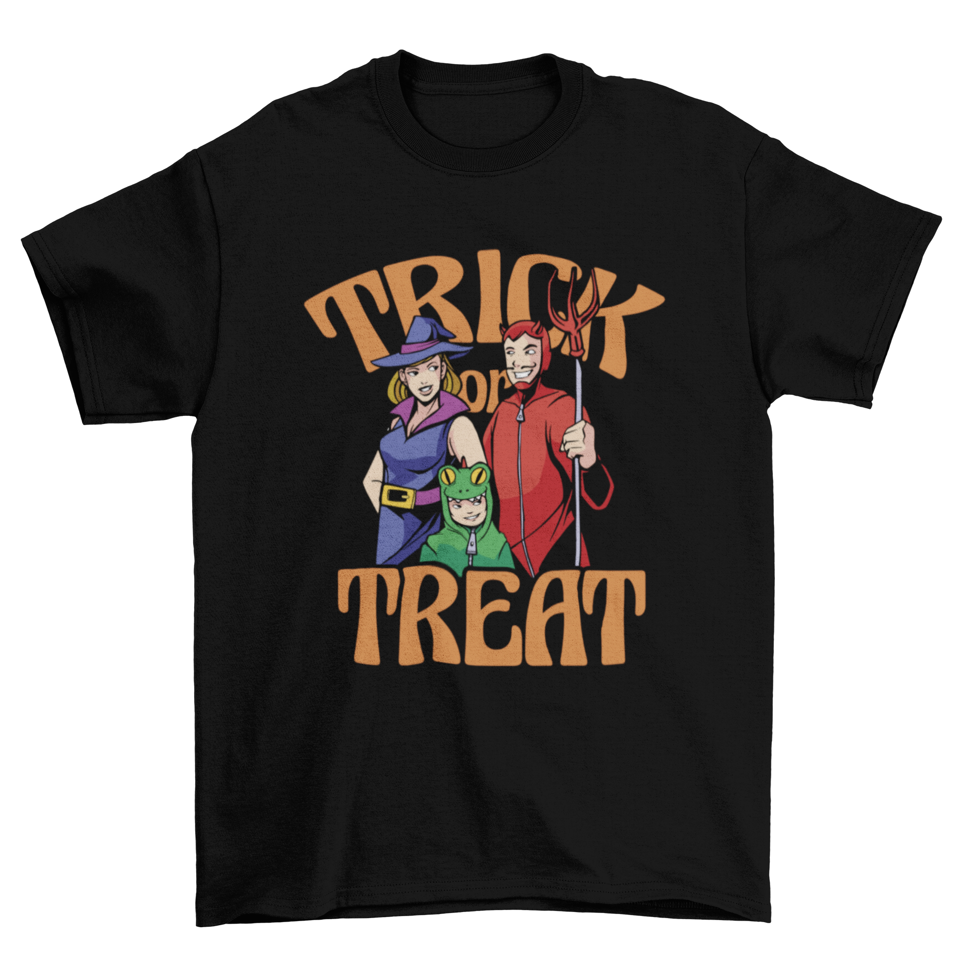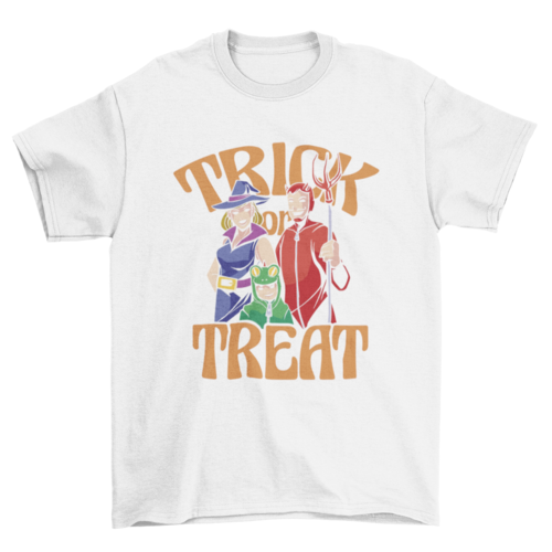Cool halloween t-shirt design with a family in costumes and the quote "Trick or treat".