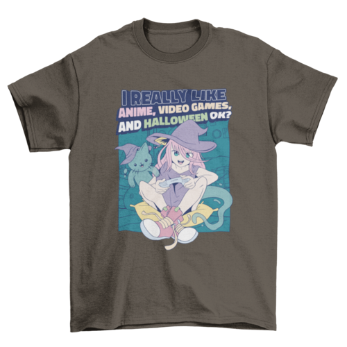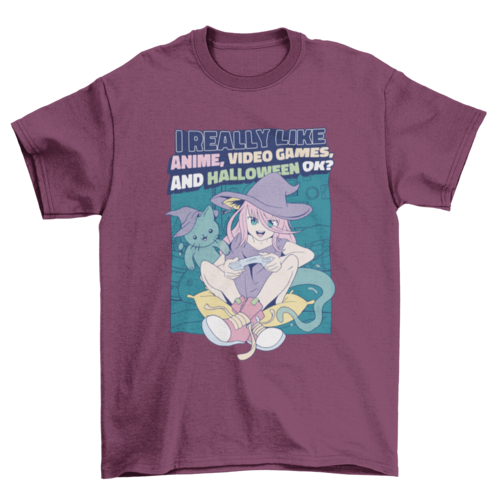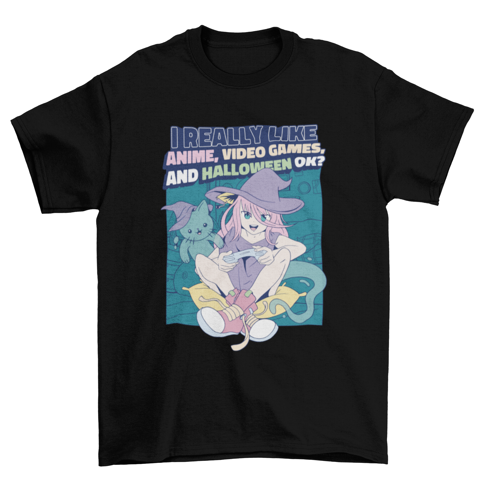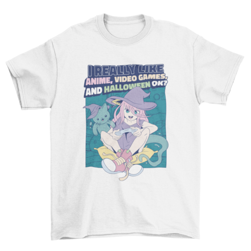 Cute Halloween t-shirt design of a girl in anime style playing video games and the quote "I really like anime, video games and Halloween ok?".