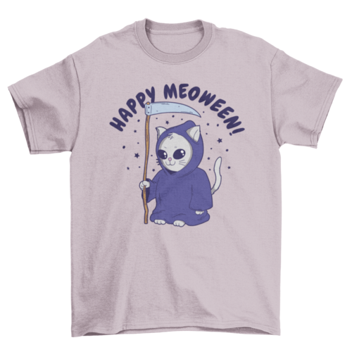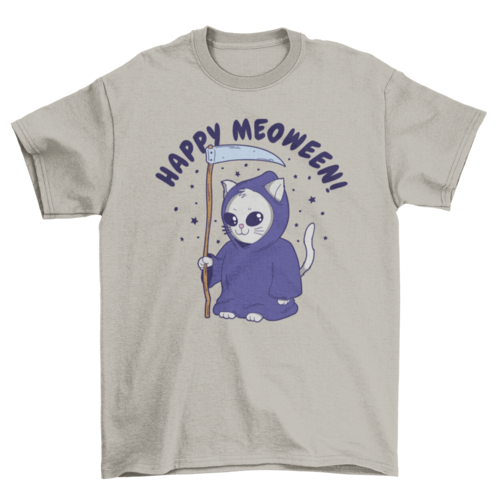 Great t-shirt design of a reaper cat and the quote 'Happy meoween'.