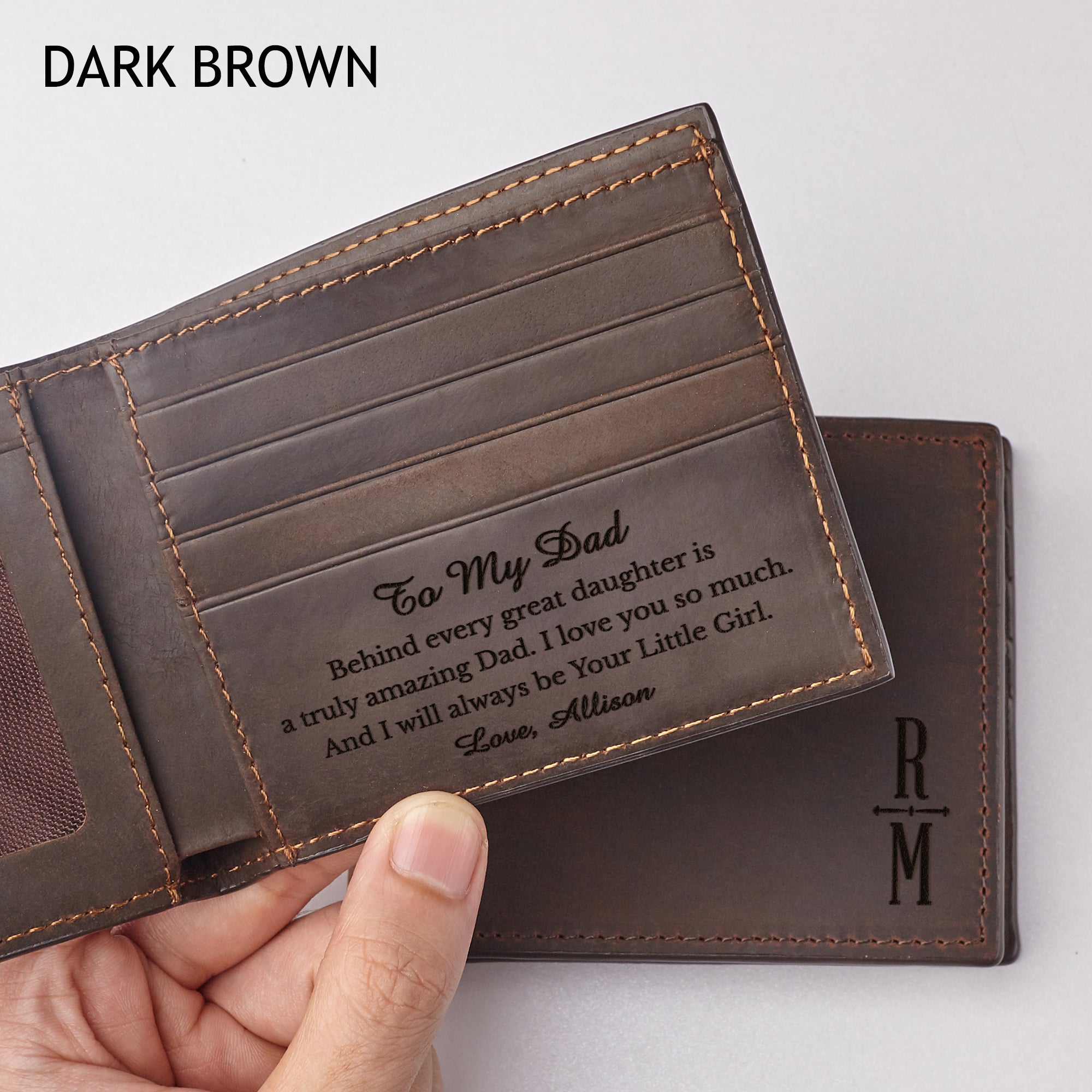 Please send us in the checkout note the following information: Enter 1. Front (If any): Name/initials and DESIGN 2. Inside (If any): To my Dad + the message underneath + the sign off Eg Front: Barney Back: To my Daddy [your message] Love, your little daughter ABOUT THIS ITEM This wallet is engraved with your custom message on the inside. You can personalize your name/initials on the front of wallet with our font style as the picture displayed. It will be a perfect gift for Dad on Father's day. P R O D U C T • I N F O ✅MATERIAL: Genuine Leather ✅DIMENSIONS: 4 3/8" x 3 1/2" x 5/8" (11x9x1.5 cm) ✅FEATURES: - 1 money slot - 5 card slots - 2 hidden slots ✅PERFECT UNIQUE GIFTS & PACKAGE: It's a perfect gift for yourself and your loved ones: your mother, friend, girlfriend, grandma, sister, wife, daughter on Anniversary, Birthday, Special Occasions, Christmas' Day, Wedding and much more! All of our jewelry are handmade from scratch and packaged with care in our workshop. Come in complimentary gift box. ✅SATISFACTION GUARANTEED: Each item is carefully handcrafted & undergoes a rigorous inspection process to ensure our products meet the highest possible standards. All engraving comes with a satisfaction guarantee.