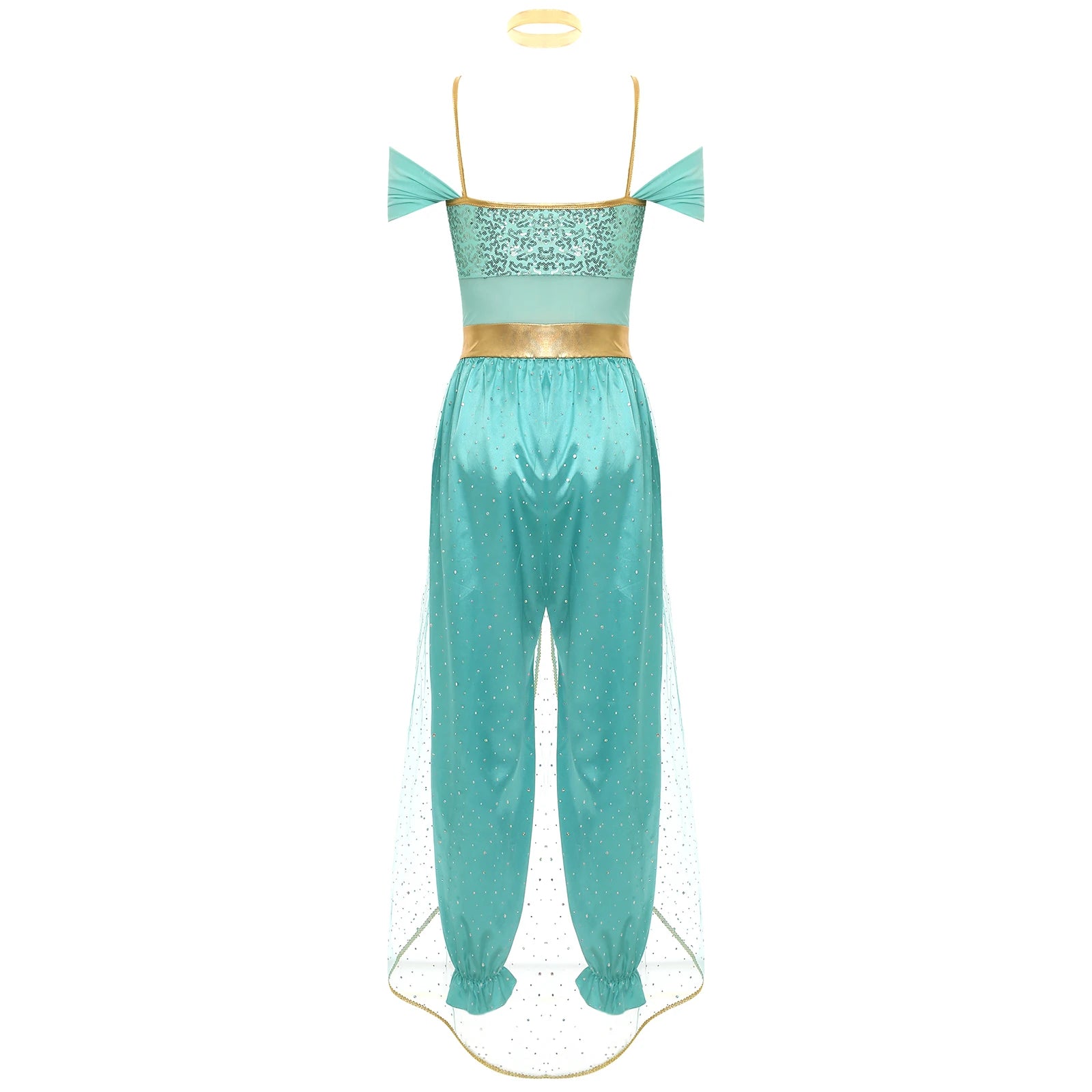 Jumpsuit designs with spaghetti straps, sequined bodice and long bloomers, tulle train, gold details and gem decorations; attaches a choker.